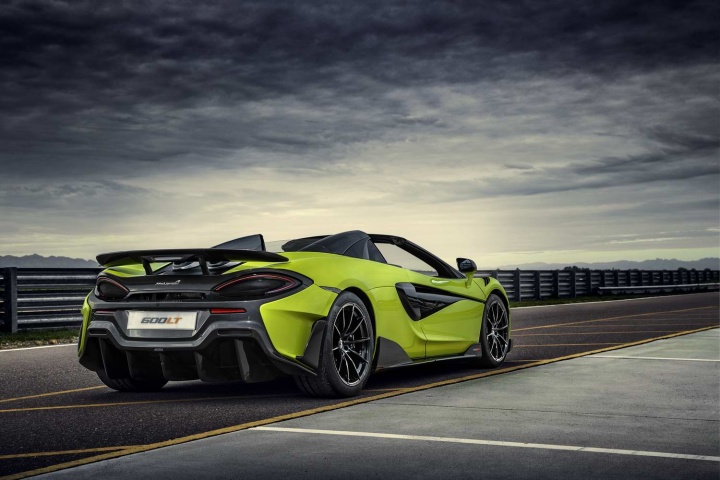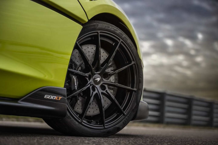 With the roof in place, the 600LT Spider doesn't look very different to the coupe, and anyway, you'll be distracted from the roof join lines by the carbon fibre bodywork. It looks seriously menacing, but the changes from the 570S Spider play a vital part in how the 600LT performs, generating up to 100kg of downforce at 250km/h (same as the coupe manages). The fixed rear wing, low splitter up front, edgy side sills and massive rear diffuser are all present and correct. As are the deck-mounted exhaust outlets ahead of the back spoiler and lightweight wheels of a bespoke design to the 600LT range, shod in Pirelli P Zero Trofeo R tyres.
