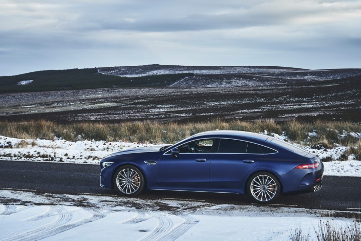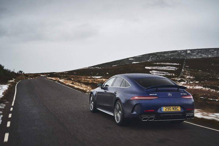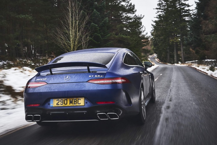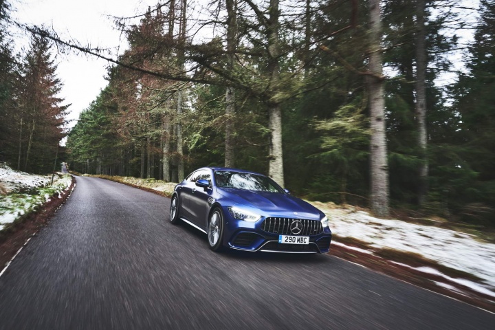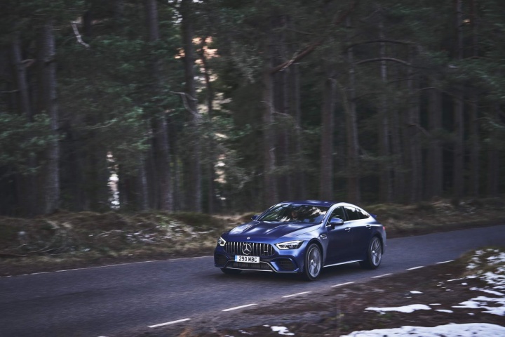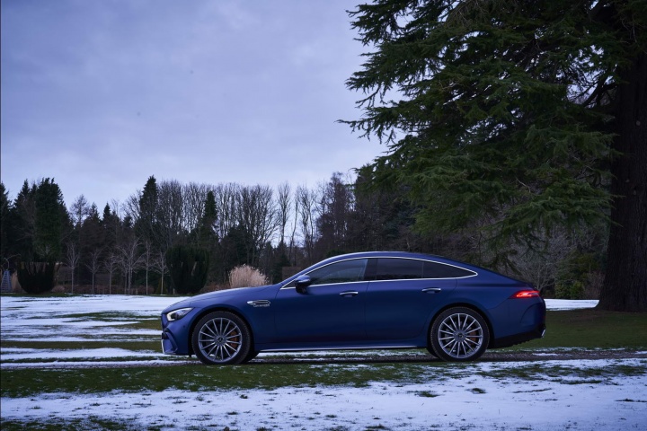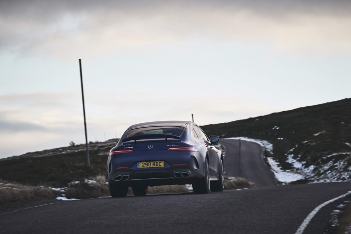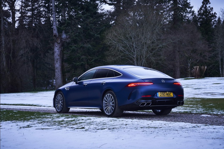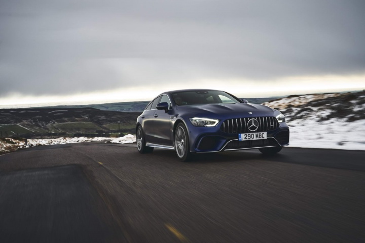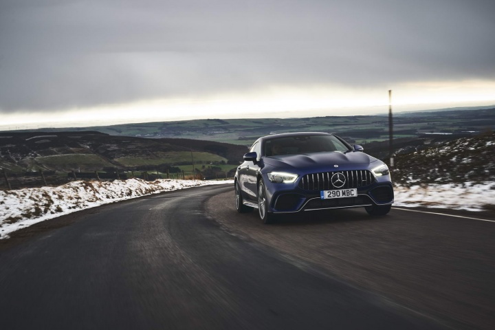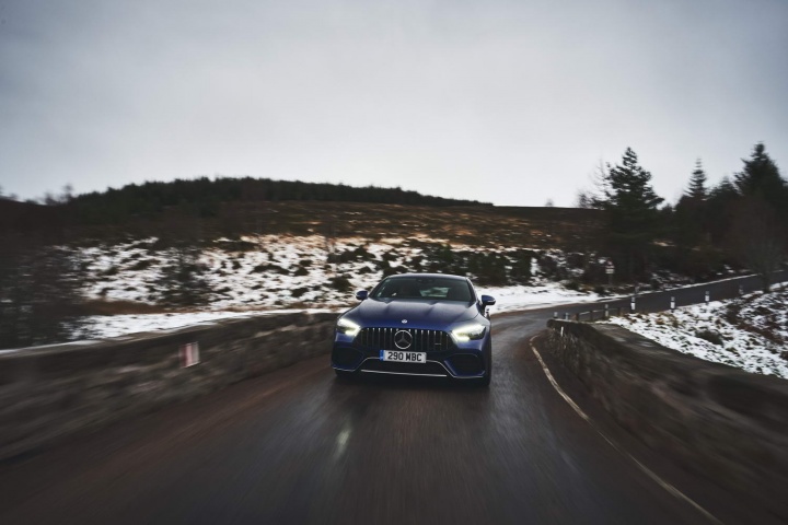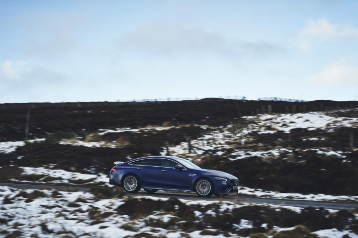 Let's get the painfully obvious stuff out of the way first of all. Either of these AMG GT four-door models is quick, with a capital 'FUPPING'. Honestly, the way the 63 punches at the horizon is enough to take your breath away, but the 63 S is even more demented, ripping through its lower gears of the gearbox in a frenzy of sheer, relentless pace. Bearing in mind we drove the 639hp model in a snowstorm, we decided to test this neck-snapping acceleration a few times and then treat the car with a little more decorum. Good job we did; the licence-losing potential with these two is immense.