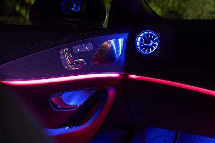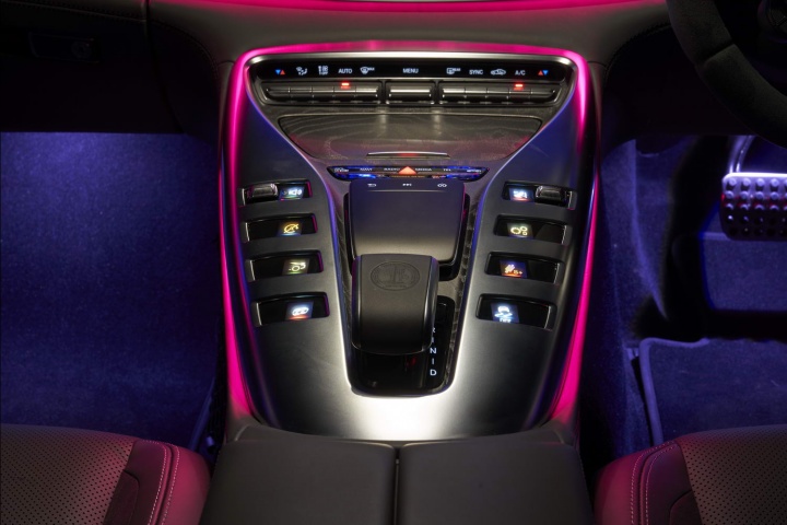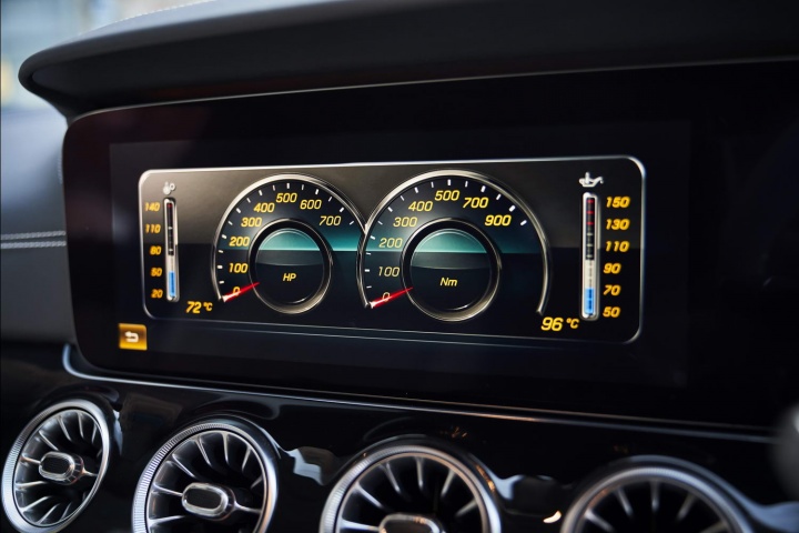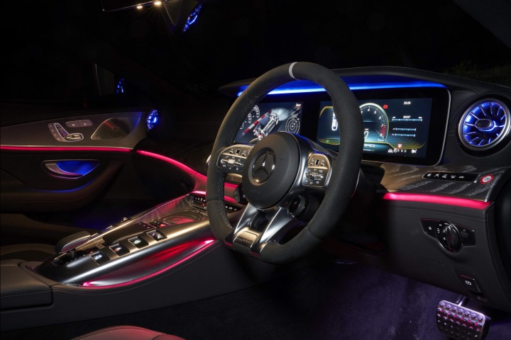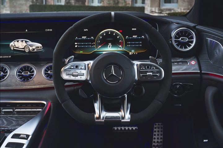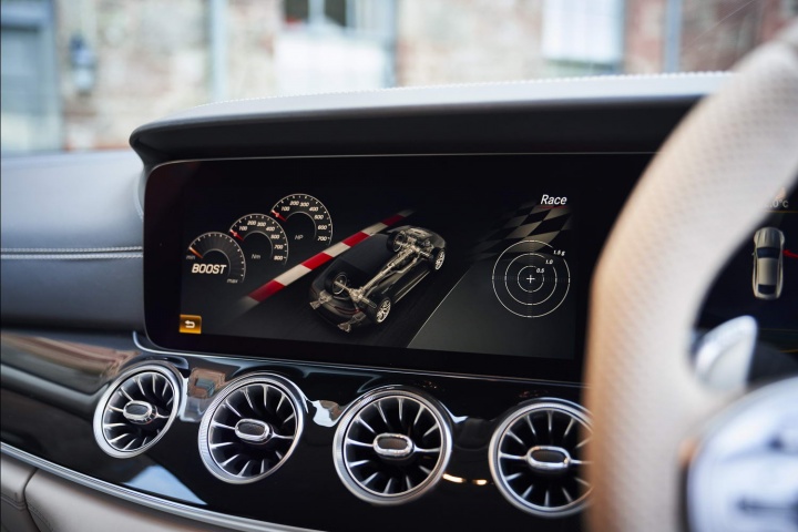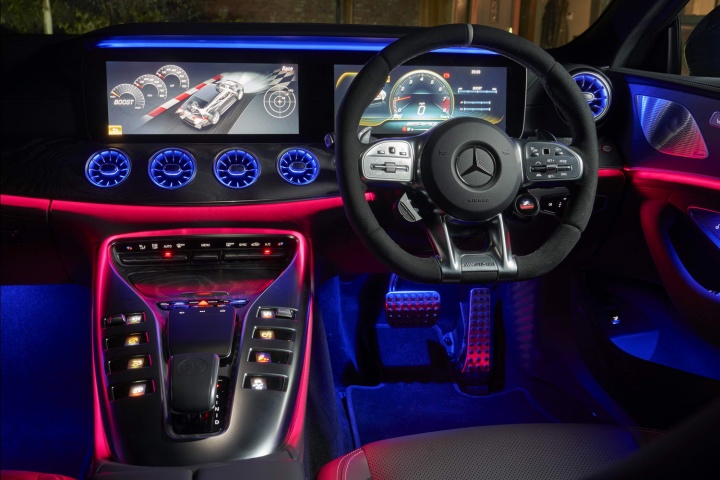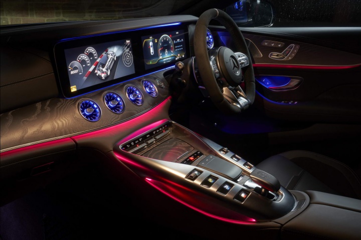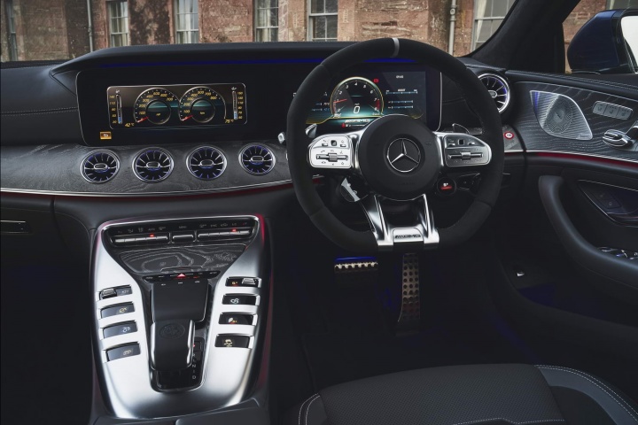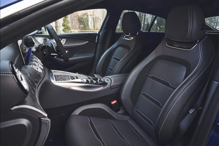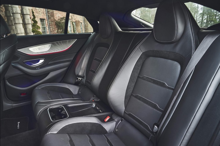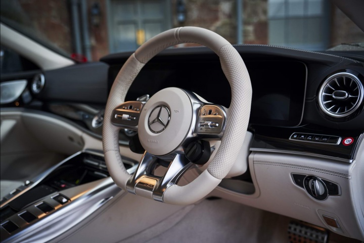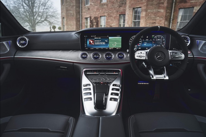 Inside, the interior feels more CLS than GT, because the beautiful dashboard is dominated by the twin 12.3-inch widescreen displays of the more saloon-like upper-end Mercs of the late 2010s, rather than a standalone infotainment screen and then a largely analogue instrument cluster. Down the centre console run a number of switches, in two banks, that control all the adjustable settings on the AMG GT four-door, but these are also subtly different to the buttons in the sports car model - in, say, a GT R, they're physical items, but in the four-door, they're small LCD displays that change graphics and colours, according to their settings. They're echoed by clever little digital switches on the wheel, which allow the driver to cycle through all of the various settings by tapping the touchscreen part of their make-up, in turn allowing clicks of the two plastic buttons next to them to change the suspension or the exhaust or the traction control and so on. They're like BMW's 'M1' and 'M2' steering-wheel mounted buttons, only much more versatile. Then there's the rotary drive control switch to the right of the wheel's boss, again with a digital screen embedded in it. All of which astounds you, long before we've addressed the fact the rear bench has a truly generous amount of room... albeit, you get two seats as standard back there, three chairs being a cost option. Specify those, and the rear-seat backs can be folded down, which makes something of a misnomer of the AMG's 'four-door' badging, as it's actually a five-door.