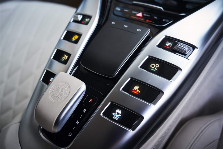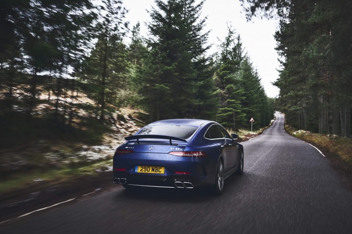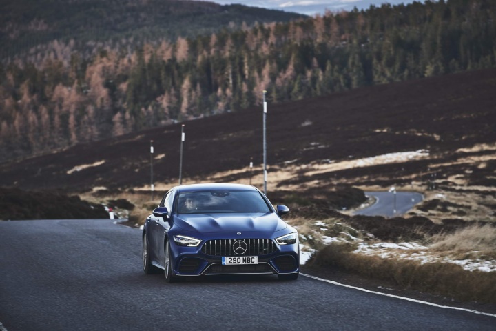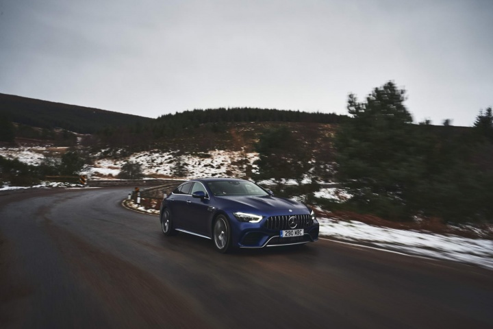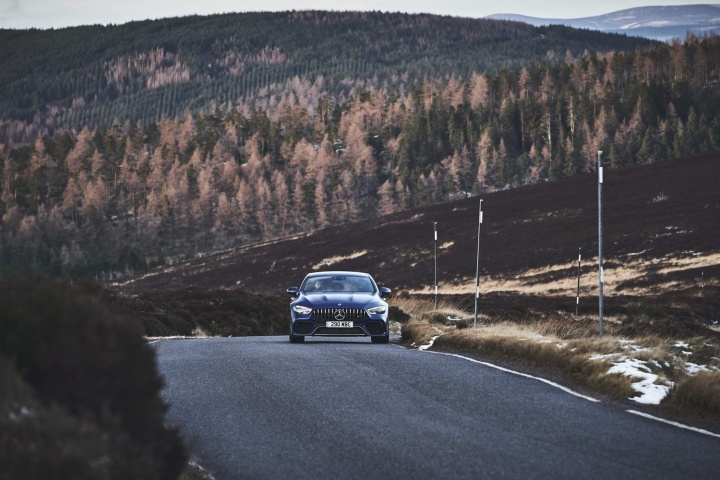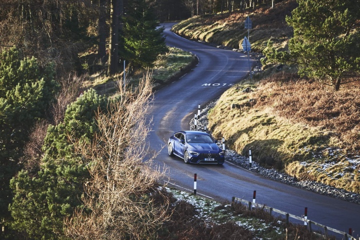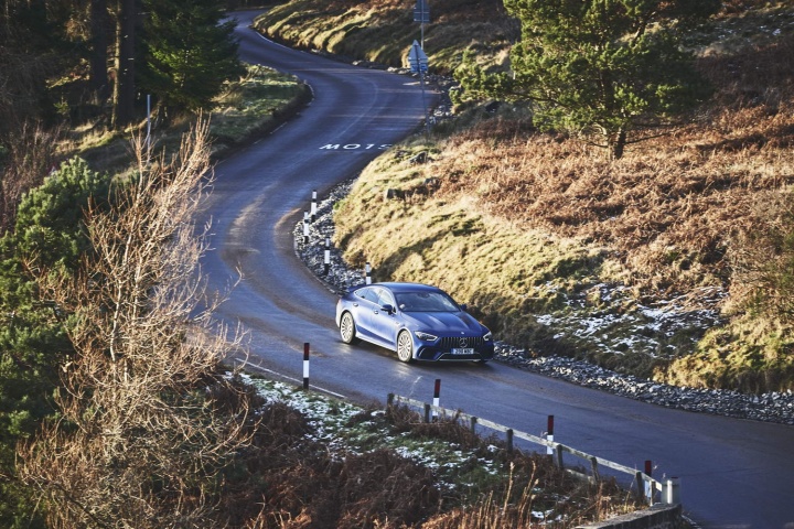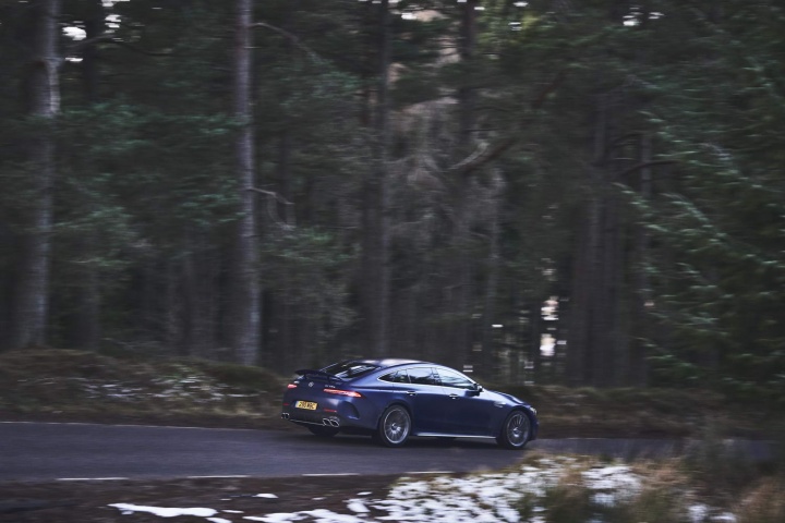 Wonderfully, its suspension is absolutely first-rate. In Sport+, on very poor road surfaces, there's just a touch too much in the way of abrupt vertical movements from the body, but at all other times this setting is more than bearable on the roads - and that's the most aggressive suspension programme the AMG GT has. In Sport and Comfort, it has a proper lope to the way it oozes along rucked-up tarmac, never once reminding you it is rolling along on 20-inch wheels with low-profile rubber. So, its tremendous thirst for petrol aside, you could imagine doing many, many kilometres at a stretch in the AMG GT four-door.