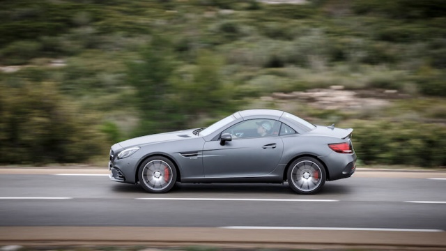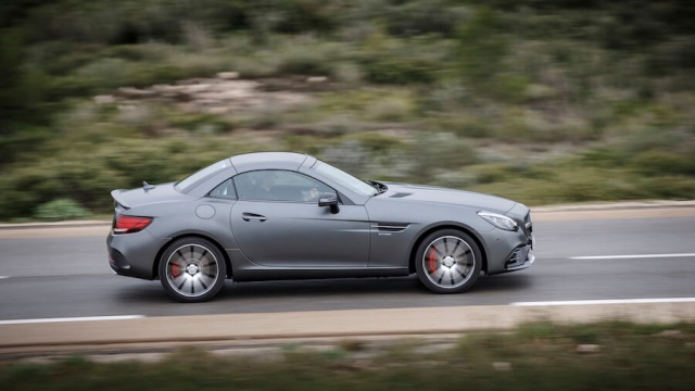 That's because it has extremely unforgiving suspension. With adjustable dampers an option (and they were fitted to all the cars on the launch), you'd think the SLC could balance compliance with rock-hard body control, but even in Comfort mode in the city it transmits an awful lot of detail about the road surface to its occupants. It also makes the SLC 43 susceptible to being knocked off line by larger bumps and compressions, although to be fair to the test cars on their standard-fit 18s, they didn't tramline or skitter appallingly. It's never uncomfortable, the AMG SLC, but it is much less easy-going than we were expecting. And if you think it's a lightweight, because it's reasonably small, think again - at 1,595kg with a driver, fuel and a bit of cargo on board, we're getting into Jaguar F-Type and even Mercedes SL territory here.