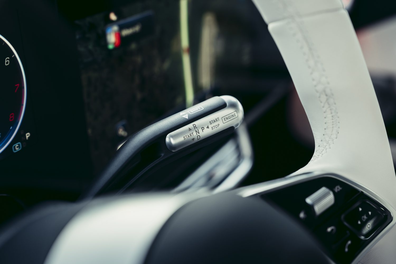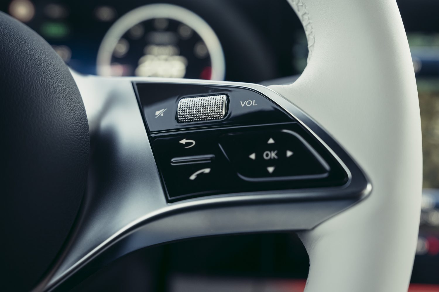 The steering wheel is a new design that features the welcome return of physical roller and rocker controls, along with some haptic elements. It's a nice size and feels right in your hands.