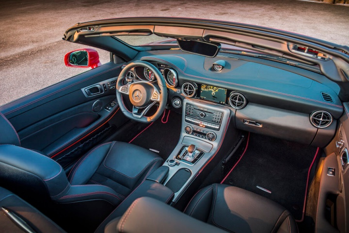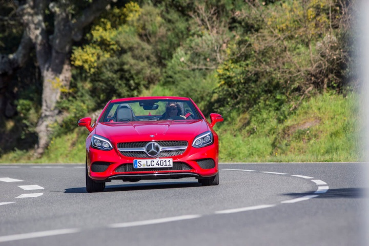 A lot of the major controls of the SLC are well calibrated, however, so it's tidy enough when you're on a nice, sweeping road and you keep it just within itself. The steering in particular is very pleasant, with quick reactions, good weighting and even a modicum of feel coming back through the rim. The brakes are effective and the nine-speed automatic gearbox responds briskly to paddle shift inputs when required, very rarely refusing its driver a requested cog swap. There's a bit of lean across the axles, notably at the rear with the hood down (when there's more weight at the back of the car, see?), which can bring on the early onset of roll oversteer. And if you get too hot with entry speeds in corners, the heavy diesel engine means understeer is never too far away. It's thus not a ragged edge car, meaning a spirited journey in it will involve short-shifting and a dearth of engine/exhaust noise, which is perhaps not what you have in your head when you dream of driving off into the sunset in a sporty roadster with a gorgeous companion by your side.