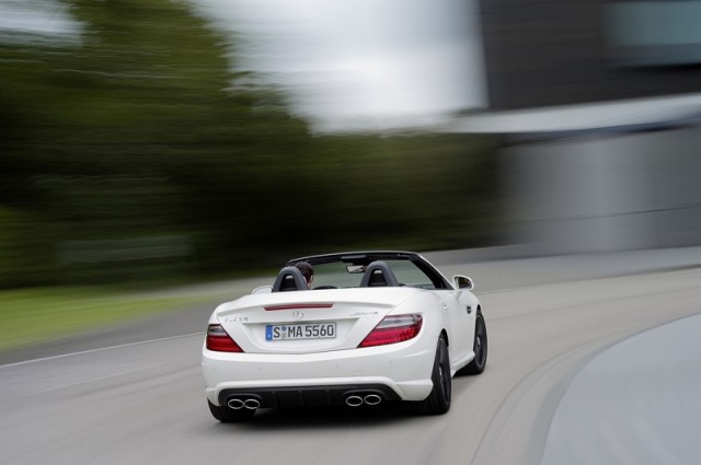 The naturally aspirated 5.5-litre V8 is actually based on the firm's bi-turbo engine of the same displacement, also found in the E 63 AMG, CLS 63 AMG, S 63 AMG and CL 63 AMG models. But the SLK ditches the forced induction, and uses new air intake manifolds, cylinder heads and oil supply system along with a stop-start function to bring about a 30 per cent improvement in efficiency over the old model - with a headline figure of 195g/km of CO2 output.