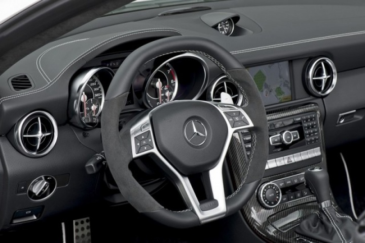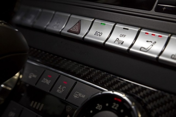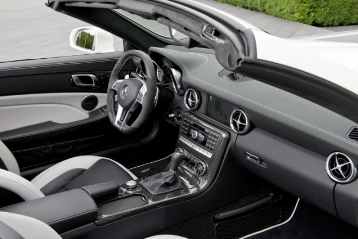 Leaving the roof up would hide the interior though, which is pretty much standard fare for this top model. For some it just won't be different enough, but it's refreshing to see that restraint has been applied when it comes to labelling surfaces with the AMG logo. Of course the wheel is moving ever closer to being square with a flat upper and lower section, and the middle of the rim can be wrapped in Alcantara, while the centre console is swathed in a carbon fibre look material.