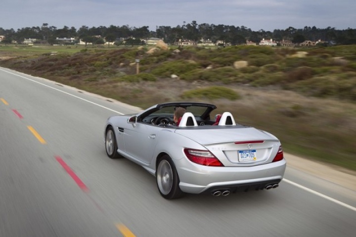 There's still the classic roadster proportions underneath though, a long bonnet and short rump ticking the required boxes. In fact, from some angles, the SLK looks genuinely menacing - especially from the front where the LED daytime running strips and oversized three-pointed star make their appearance. And while many folding hard tops can look a little disjointed with their roof in place, the SLK arguably looks better this way.