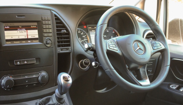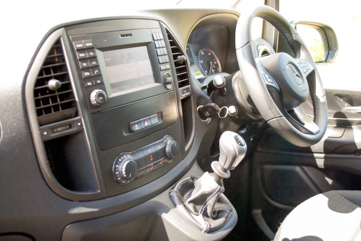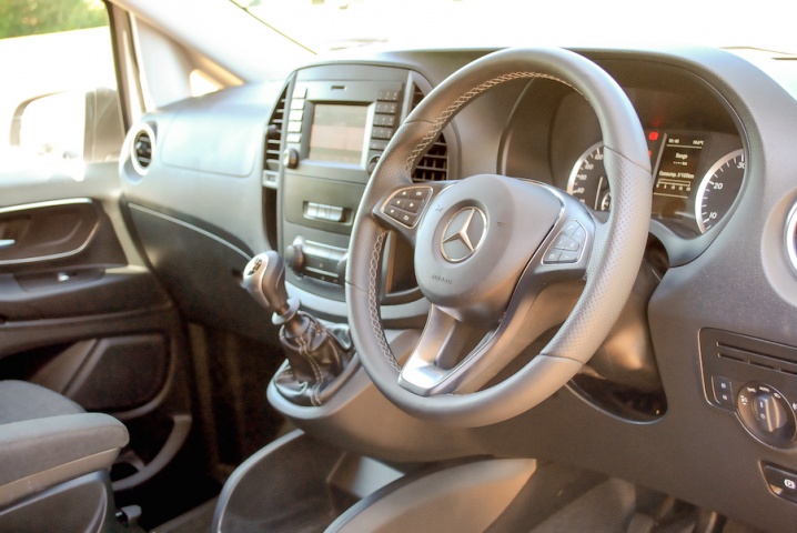 Sharing its basic layout with the V-Class the cabin of the Vito is surprisingly passenger vehicle like. The dashboard is most definitely commercial, constructed of hard wearing, no frills plastics and without some of the nicer touches you would find in a Mercedes-Benz car, but the addition of some of the switchgear from the passenger model range does lift it. The foot operated parking brake will be instantly recognisable to those accustomed to older Mercedes cars, but anyone swapping over from a Transit Custom or similar will find it odd at first and may not get used to it at all, nor Merc's insistence at putting signal and wiper controls on the same stalk. The biggest bugbear with the interior however is the archaic infotainment system and the strange lack of useful cubby holes - the ones around the infotainment system are too small for modern smartphones and the dash top one has no way of securing paperwork and the like that would commonly be stored there.
