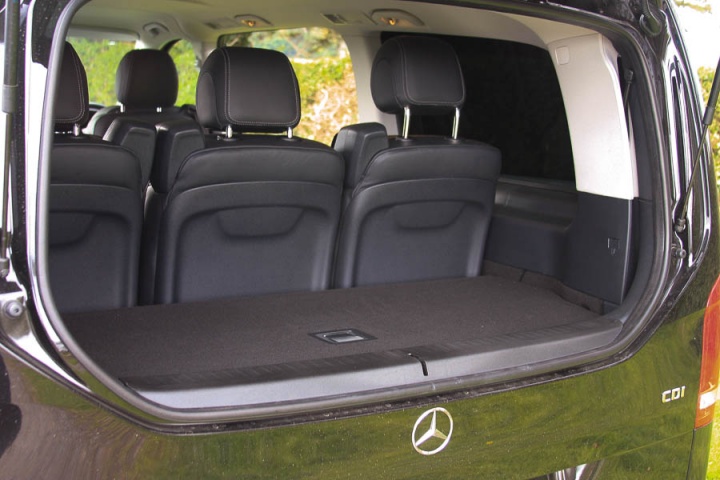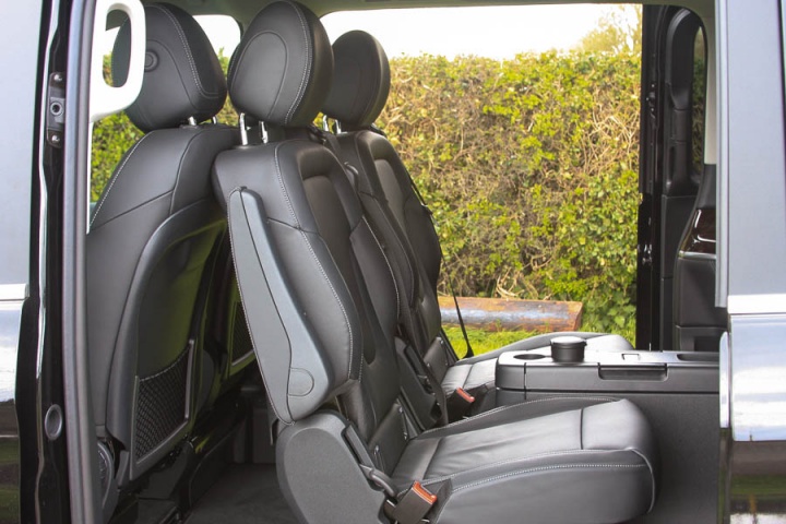 In the back, thanks to a €5000 option box-tick that also brings with it an automated parking system, there were five pleasantly upholstered seats - three across the rear, facing forwards, and two behind the driver, facing rearwards. These can all be separately lifted out and moved around, but you'd probably better ask a friend to help as they're hefty. A pop-up and fold-out table sat in the middle of the rear compartment floor, bringing just a frisson of business jet to the layout. Basically, it apes what you can get by spending similar money on a VW Caravelle, but does so with a higher-quality interior. Plus, if there's just the two of you in the back, you can stretch out and put your feet on the seats in front - seriously comfy.