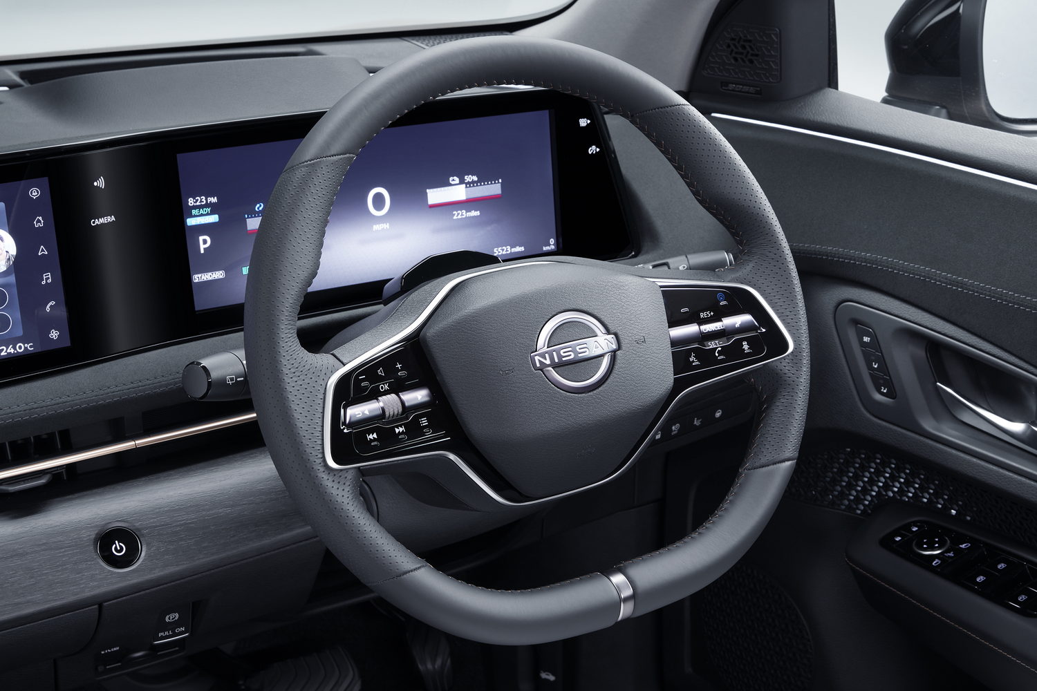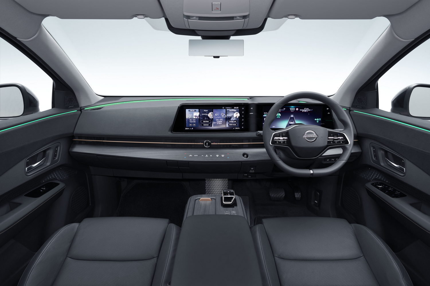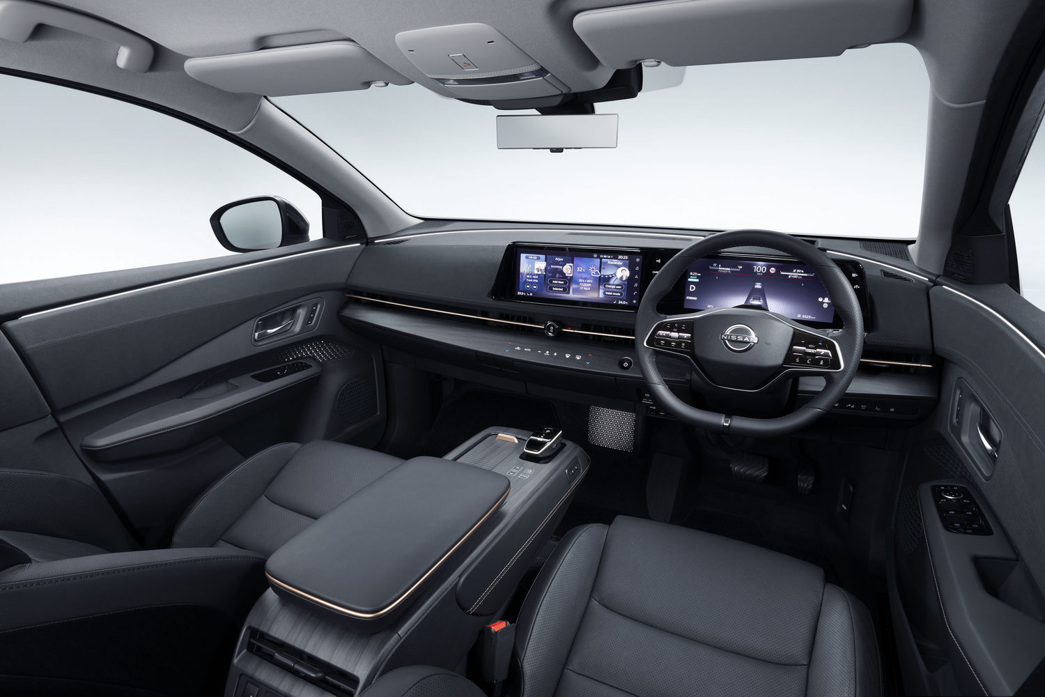 Whatever you think about the exterior of the Ariya, you're likely to approve of the cabin, as it's astoundingly good. The seats are noticeably comfortable and supportive, while the leather-wrapped steering wheel is good to hold and even the column stalks for the indicators and wipers are solidly engineered. The dashboard is dominated by two 12.3-inch screens aligned behind a single moulding. Cleverly, the centrally-mounted touchscreen is a little further from the windscreen to make it easy to reach.