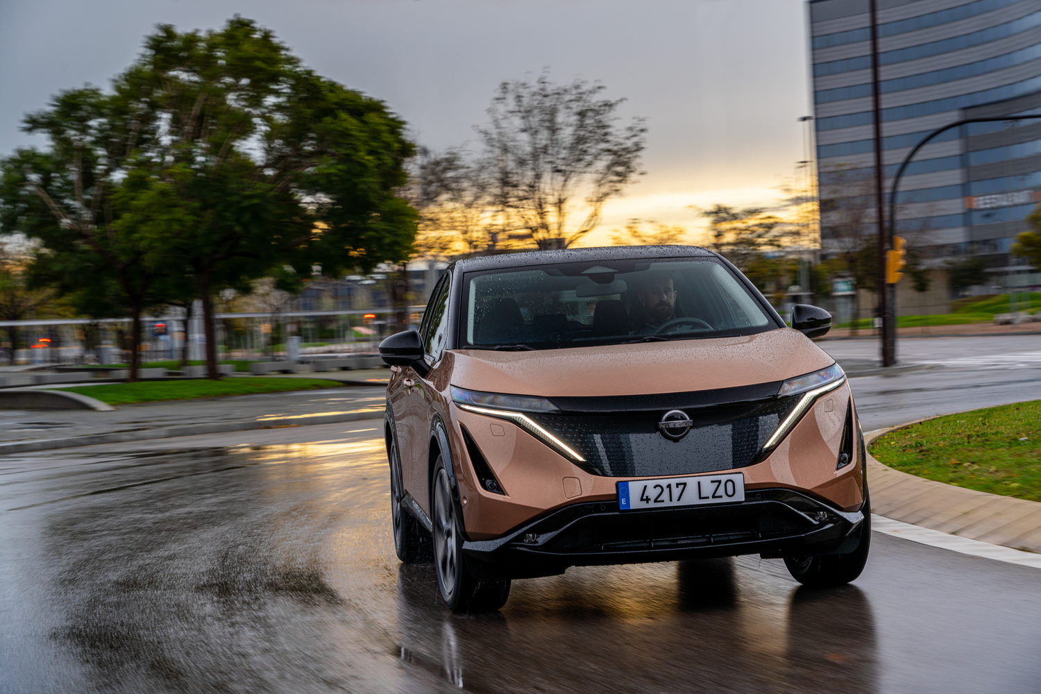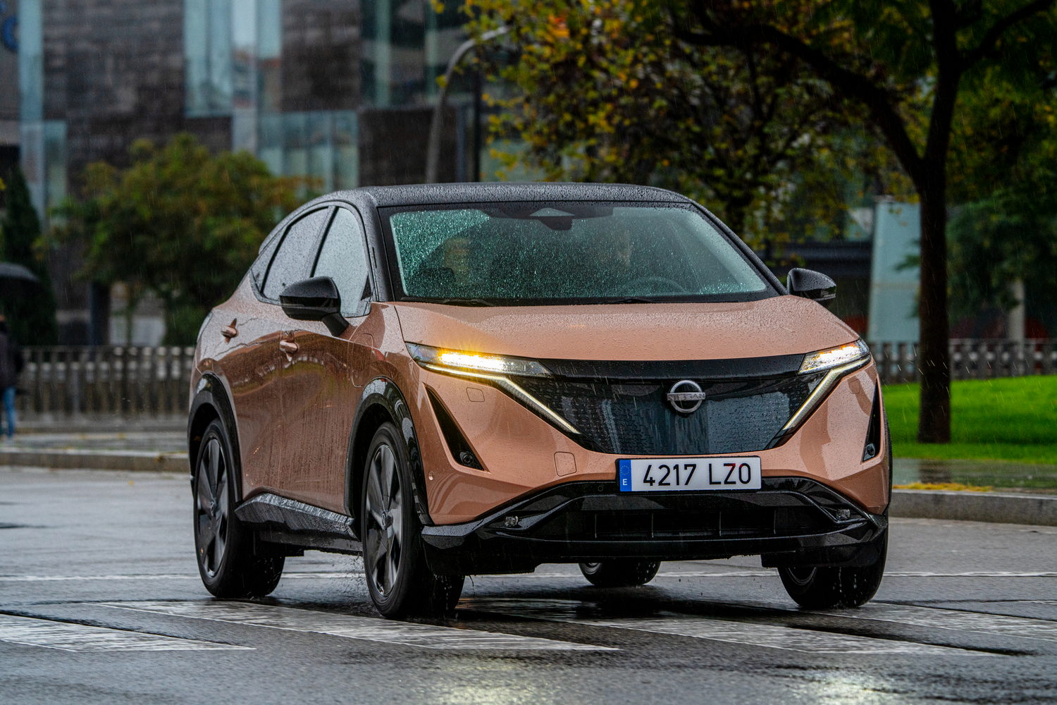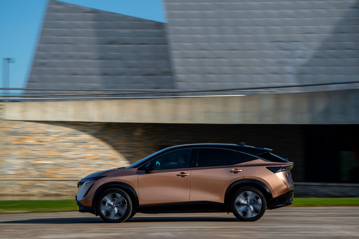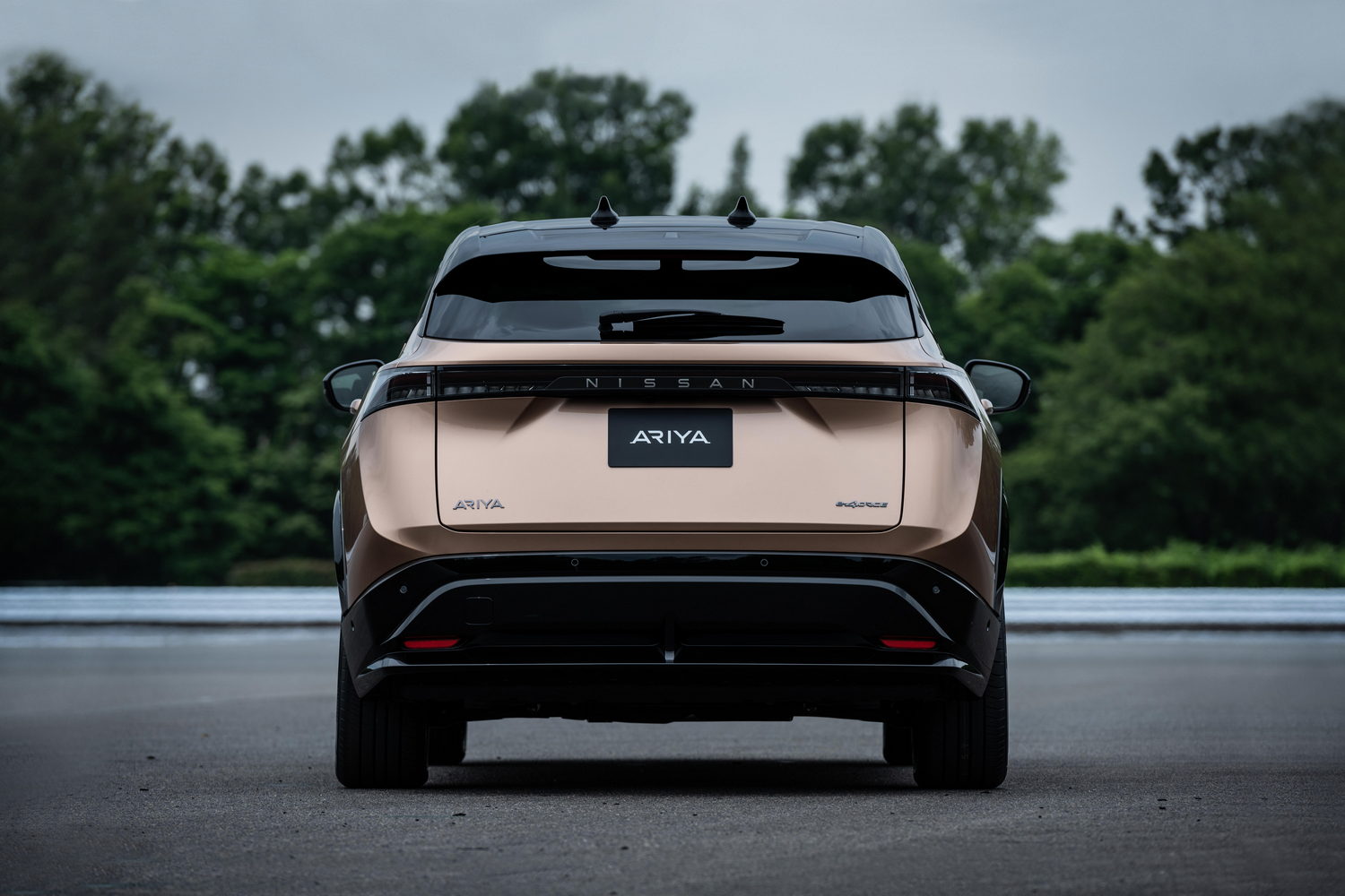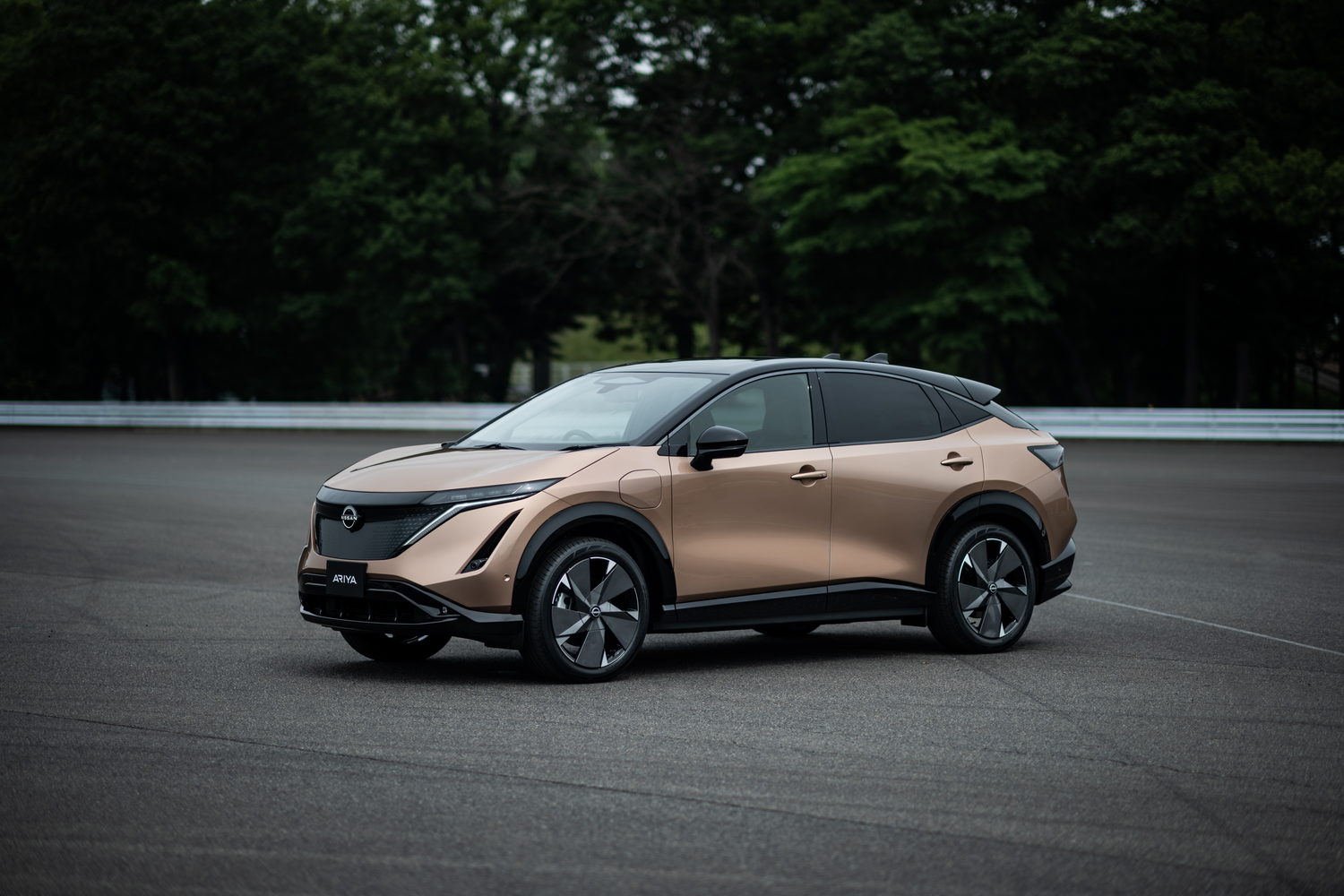 Nissan refers to the Ariya as a coupe-crossover because of its smooth and sloping roofline no doubt. It's certainly striking looking, notably so in a two-tone finish, where the darkened lights and detailing give the car a lot of presence.