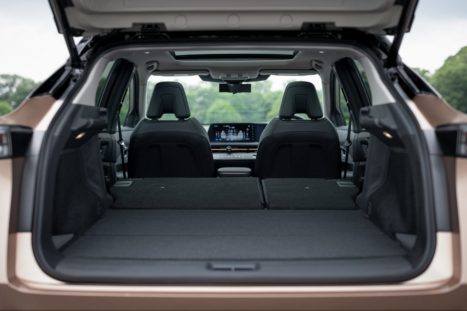 So long as that centre console is in its forward position, three adults would be comfortable in the back of the Ariya, so long as none of them are too wide or tall. In our test car, which featured a large glass roof, a six-foot-tall person would find their head touching the headlining in the rear.