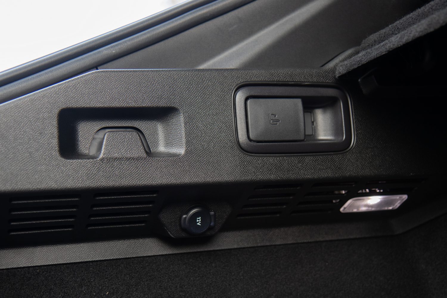 On the centre console, there are two cupholders with a spring-loaded hinged cover, a small semi-open storage area and directly under the screen a slim space which in this car houses the mobile phone charging pad. There's a useful storage area under the butterfly armrest, another small open storage box just in front of that, and reasonably spacious door bins. The gear selector is a chunky toggle switch located next to the stop-start button, and the drive mode selector lives next to that, through which, in this model, you can call up an electric-only driving mode, or Sport and Hybrid guises.
