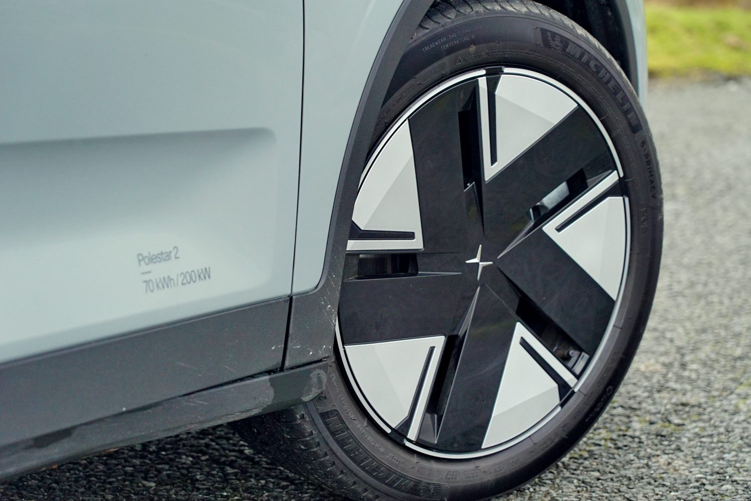 The Business Edition and Plus models wear modest 19-inch aero wheels, though these can be upgraded to a dark-grey 20-inch rim as part of the Pro pack, giving the Polestar 2 a more appealing stance. A more open design of 20-inch wheel marks out the Performance pack, all the better to spy the 'Swedish gold' Brembo brake callipers behind.