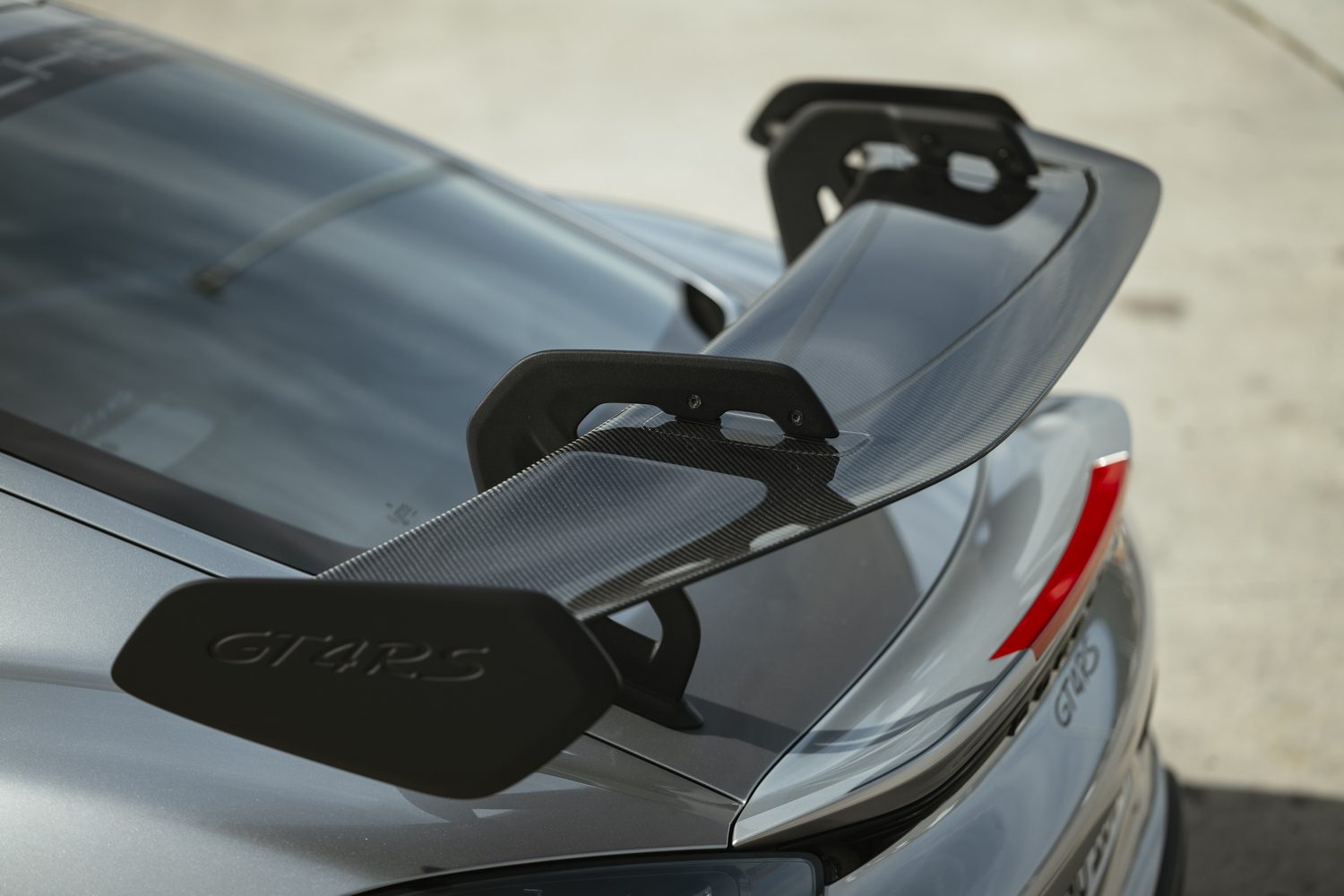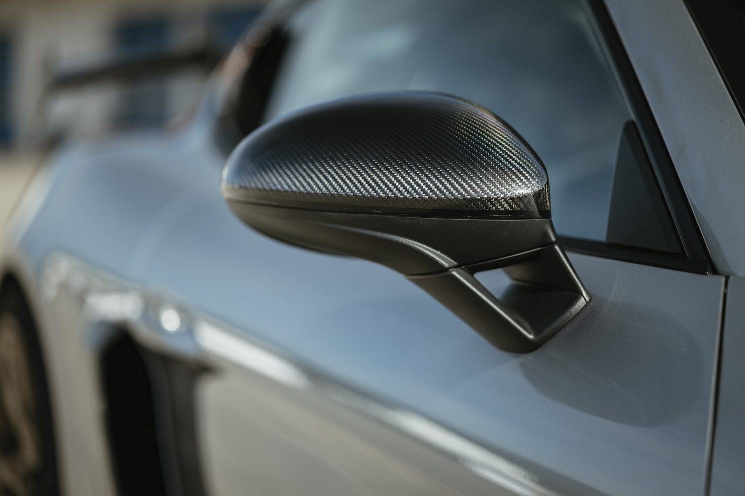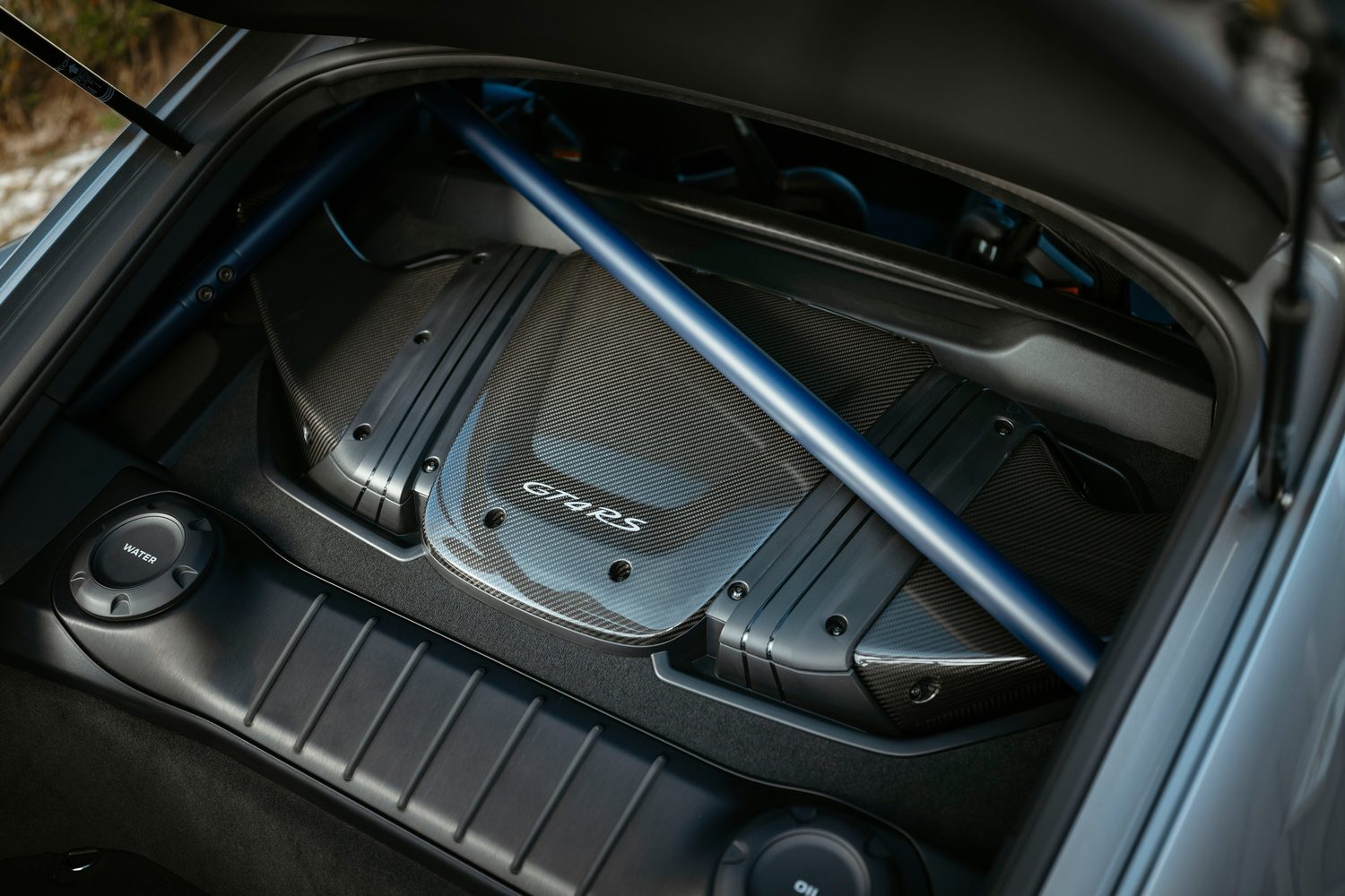 Add all that to the 30mm drop in ride height compared with the standard Cayman and the GT4 RS looks like a true road-going racer. And that is compounded by our test car's Weissach package, which includes the carbon-weave front luggage compartment lid, magnesium alloy wheels and titanium exhaust, as well as the Porsche lettering across the rear window.