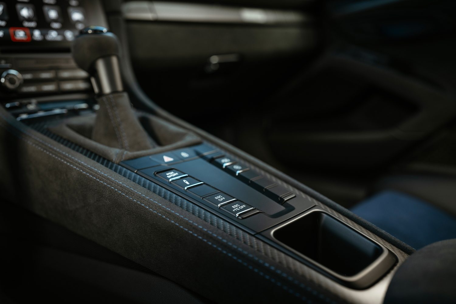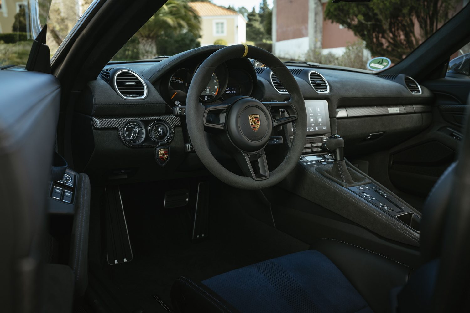 The sporty look continues inside, where both seats are full lightweight buckets with carbon-fibre, while the conventional 718 dashboard is lined with Race-Tex microsuede upholstery. The steering wheel, which is devoid of distracting buttons, even comes with a yellow 'dead-ahead' mark.