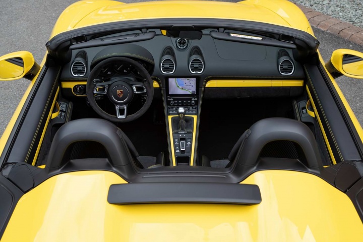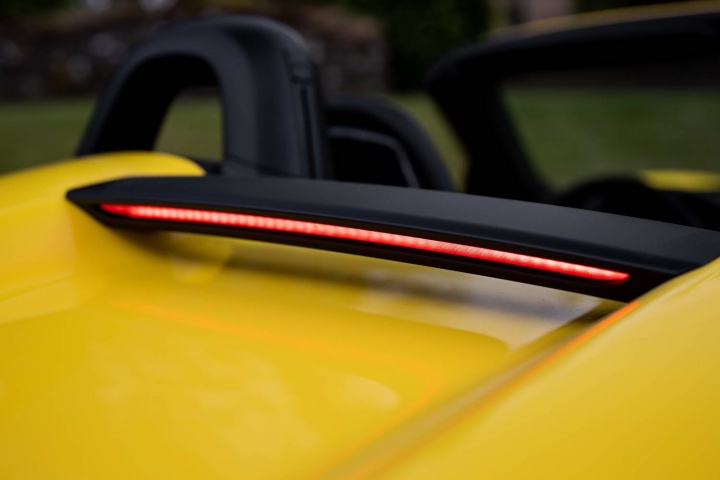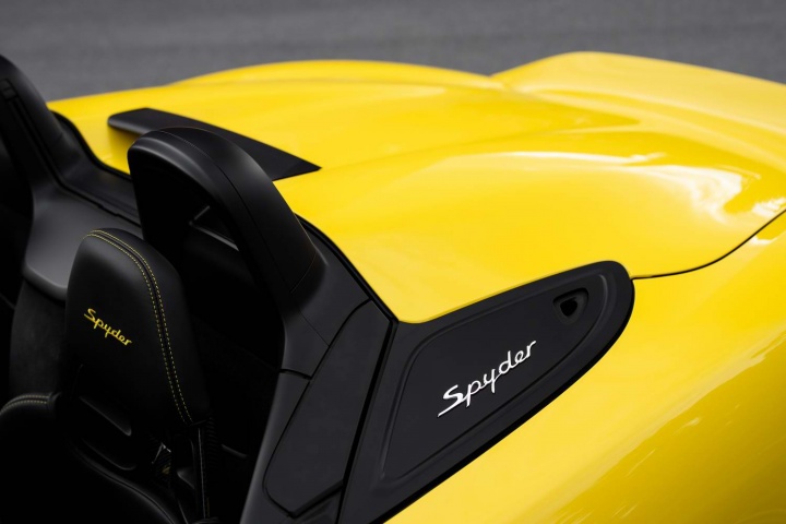 We're fans of the current Porsche 718 style, but it's been ramped up a notch for the Spyder with a restyled front end from the Porsche GT school of design. It looks great, but it's not all for your viewing pleasure (ok, the little embossed 'Spyder' script in the middle of the splitter is cool), as a huge amount of aerodynamic work was done in the wind tunnel to increase downforce without increasing drag. Apparently, the 718 Spyder is the first car in the Boxster family to generate actual downforce at the back (it gets an automatically deploying spoiler rather than the fixed wing of its Cayman GT4 sibling, but retains a fancy new diffuser design). Oh, and the 20-inch rims are fitted with ultra-high-performance tyres as standard. Nobody cares about any of that, we reckon, as it's all about the retro humps behind the seats, isn't it?