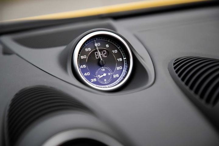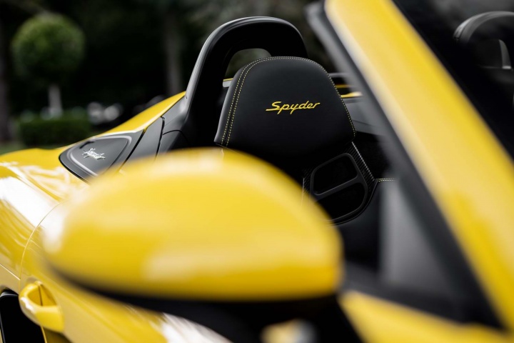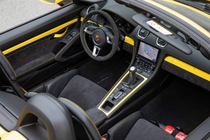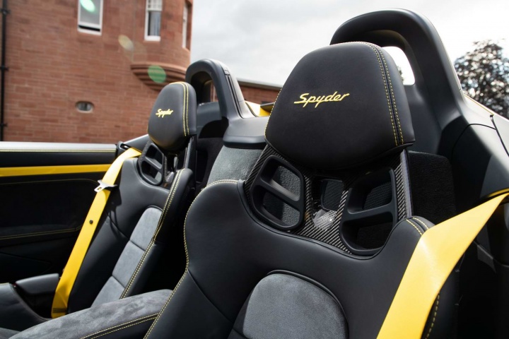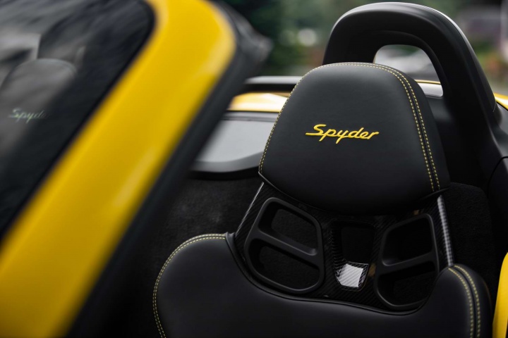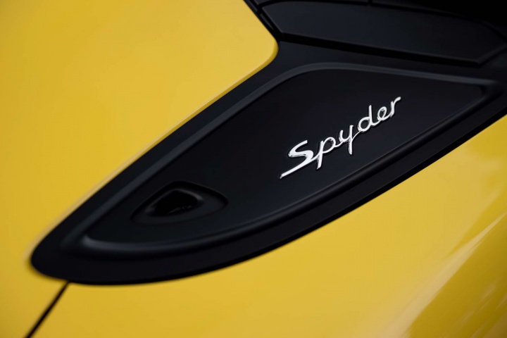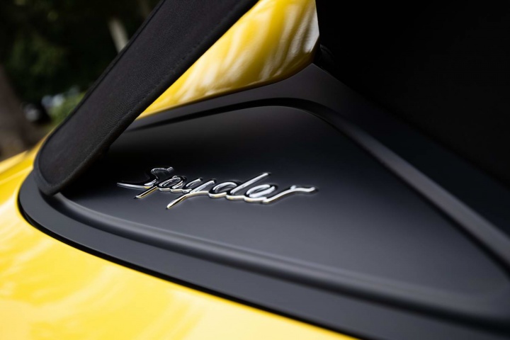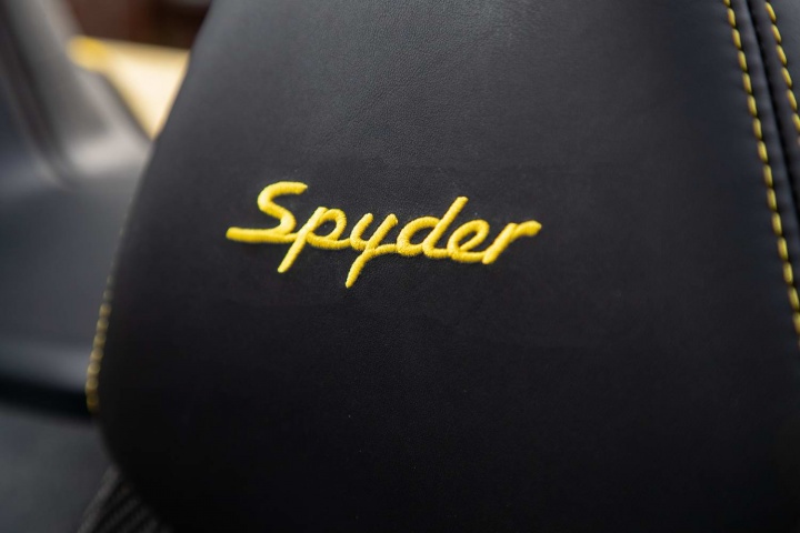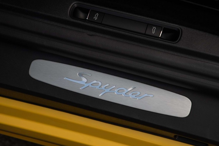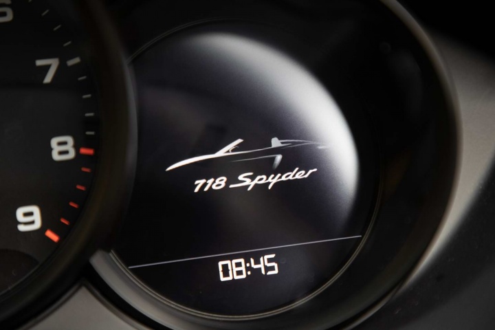 The rest of the cabin is gently tweaked, including a simply round Alcantara-clad steering wheel with a slender rim, door pulls instead of handles, lovely leather/Alcantara sports seats and plenty of 'Spyder' logos. The Chrono Package with dash-top stopwatch is standard, as is Porsche's touchscreen infotainment system.