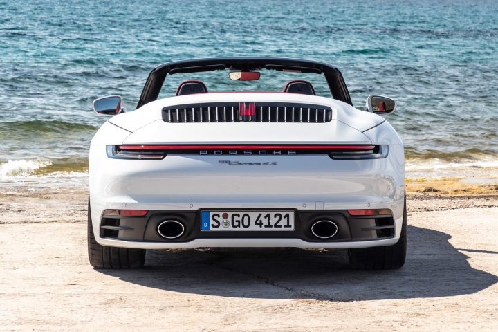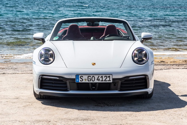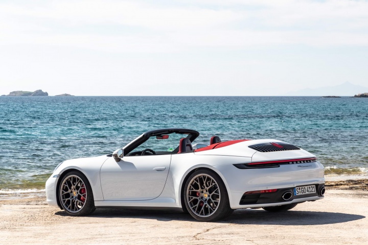 Take the 992-shape of Porsche 911 and remove the roof, and you're left with the familiar silhouette of the new Cabriolet - even though you've not actually seen the model before this point. Honestly, the look of the latest addition to the 992 family is not surprising in the slightest, but that's no reason to dismiss it out of hand, either. What you might not be so comfortable with is the slightly hump-backed appearance of the 911 Cabriolet; try to stash a folding roof (new design, lighter construction, acoustically terrific and capable of being folded away/unfurled fully electrically in just 12 seconds, even on the move at up to 50km/h) and a 3.0-litre flat-six engine in the back of a reasonably compact sports coupe means the Cabriolet looks a bit, er, bum-heavy in open-top guise. Viewed from dead-on rear, the height of the rear deck isn't much lower than the windscreen's header rail, so when you're following a 992 Cabrio it's not the car's best angle.