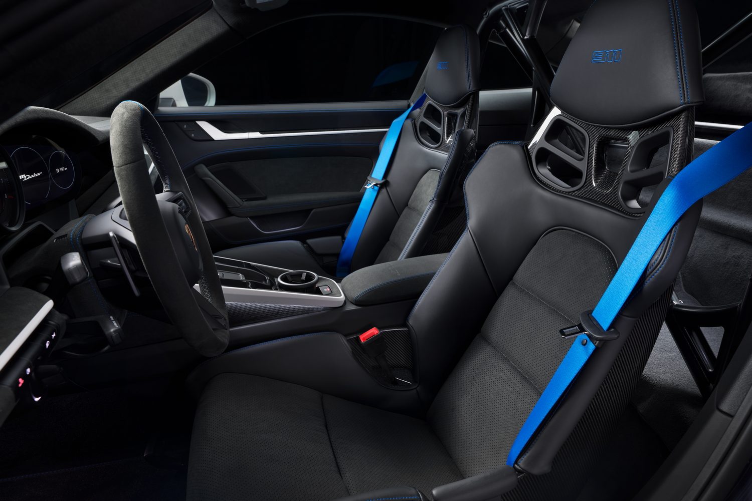 Saying that, buyers can opt for a bolted-in roll cage (packaged with six-point harnesses and a fire extinguisher), which enhances the competition car feel, while the thin-rimmed steering wheel has a top-centre marker. It feels like a GT3 inside at first in fact. There are a few Dakar-specific items and bits of trim, though, including a build-number plaque on the dashboard. Trim panels there and the door handles are green by default or white when the Rallye Design Package is specified. Green is on the backs of the seats, too, though that's swapped for blue in the Rallye Design car, a colour that extends to the seat belts. Oh, and there are rubber floor mats, as Porsche expects them to get dirty...