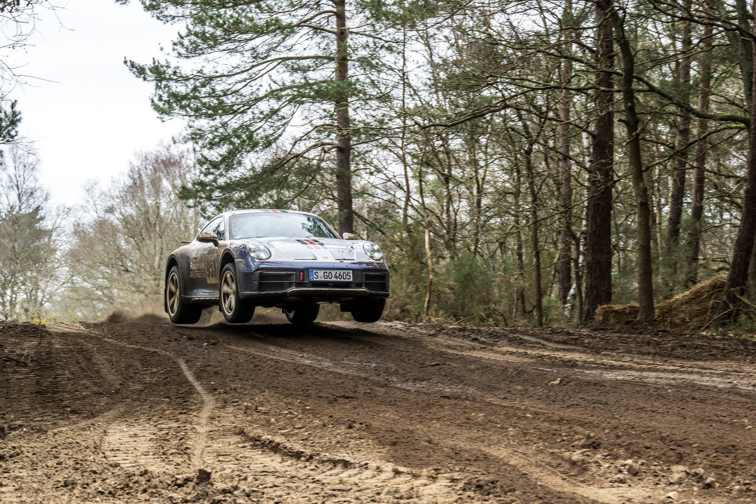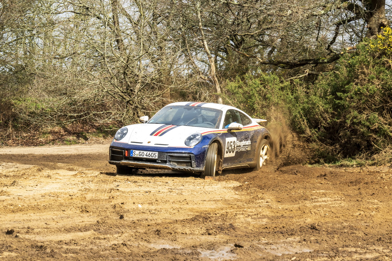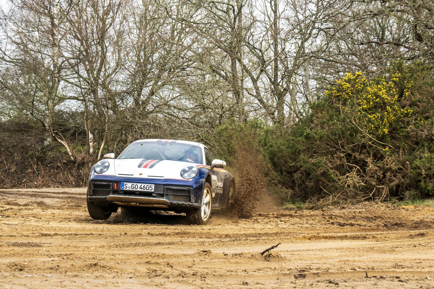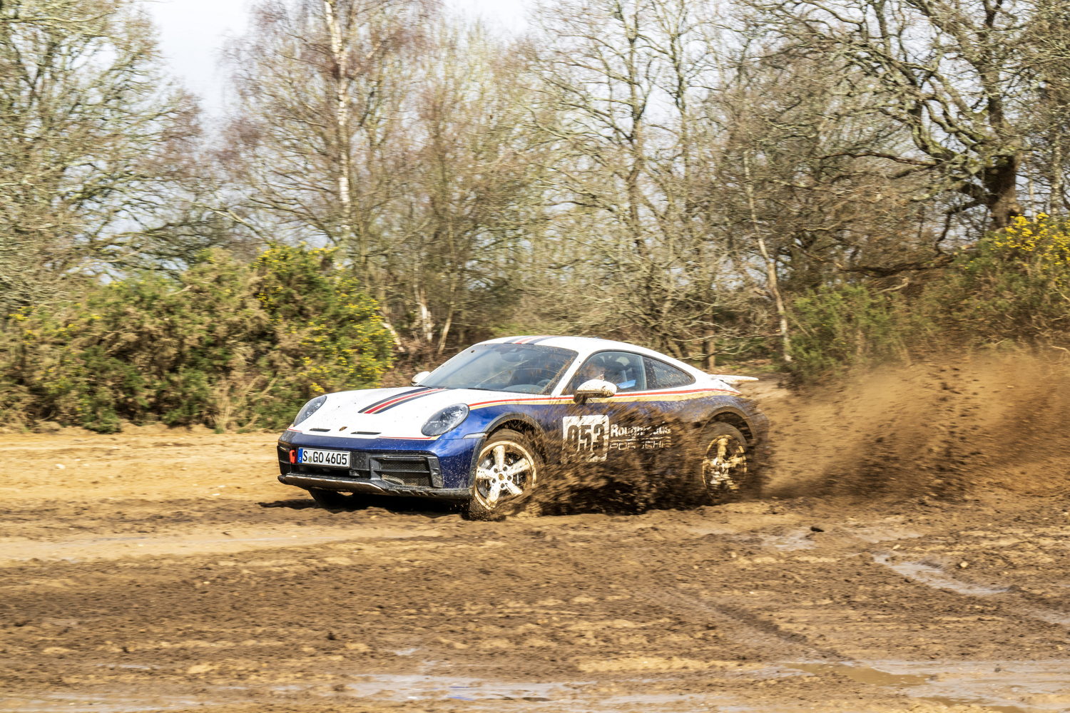 We took the 911 Dakar out on the road to begin with, along a narrow and twisty back road. It was raining and cold and the surface was potholed and rutted, while the edges of the road crumbled away into muddy verges. The car excelled, feeling all but invincible and shrugging off the conditions. It was best left in the default Normal driving mode though, as the dampers are very firm in the Sport setting. The longer-travel suspension gives the Dakar a distinctly different response to bumps than that experienced in other 911s, though the body control overall is still sublime.