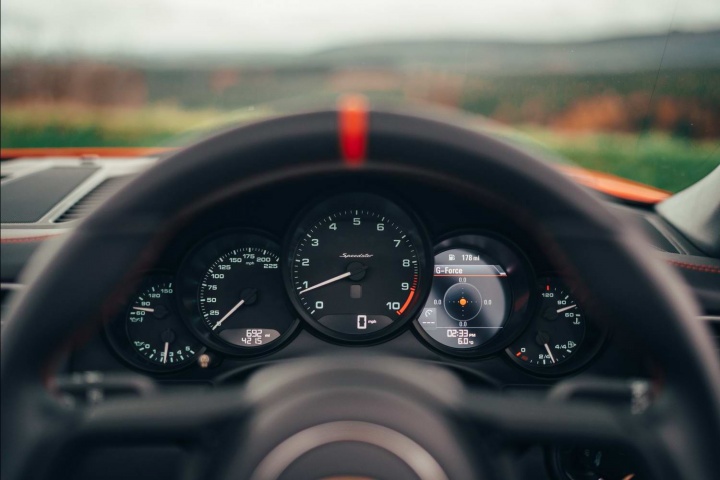 Overall, the Speedster looks gorgeous. The 992 might now be out and about, but externally the 991 Speedster can live with it for jaw-dropping, head-turning magnetism. The same can't quite be said of the interior, though. Specific touches include black leather on the side bolsters and head restraints of the carbon-fibre bucket seats, as well as the door armrests and gear lever, with lightweight panels in the doors necessitating the fabric-loop pulls and stowage nets. 'Speedster' logos adorn the head restraints, the door sills and the central rev counter, which sits in a cluster bearing white needles and green numerals on black dials as a direct nod back to the 356 Speedster, and there's a plaque on the bulkhead to say which of the 1,948 examples (1948 being the year Porsche started making sports cars; the Speedster launched in 2018 as a 70th birthday present to itself) of this special 911 you're sitting in. Brave buyers could opt to go without either air conditioning or the satnav, so the Guards Red model we're in is a luxury item in comparison, but this cabin - as lovely as it is, and blessed with an oh-so-perfect driving position too - feels dated by comparison to the latest 911's showy, high-class interior. This is a very, very minor gripe about the Speedster, though, that we've only included in order for it to masquerade as some sort of objective critical balance, as you shall soon see...