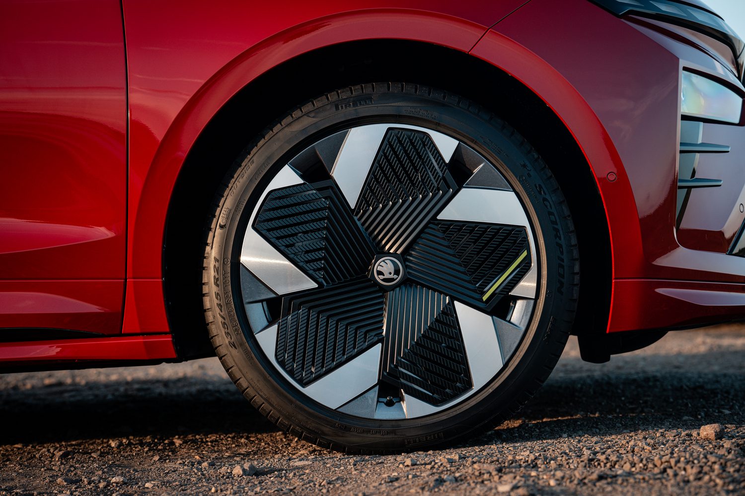 Beyond that, to mark it out against other Enyaqs, the RS sits on 21-inch 'Vision' alloy wheels, it's 15mm lower to the deck at the front and 10mm lower at the rear than other models in the SUV's family, and much of the exterior detailing - the wheels, the window trims, the sides of the rear spoiler, the door mirrors and the bumper inserts - are rendered in black.