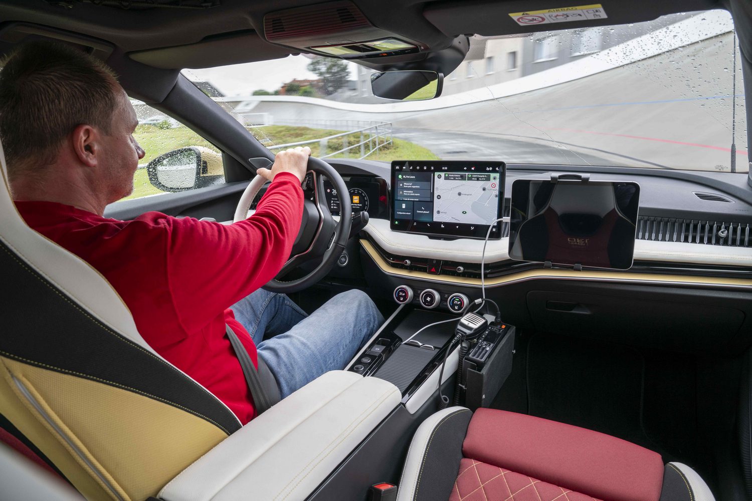And the colour scheme is far from the only change. On the passenger side, Skoda has mounted a tablet to help the car's crew keep an eye on race progress and to aid communications, while there's a radio bolted to the centre console to provide direct communication with teammates. On the ceiling, meanwhile, there's a cargo net to try and ameliorate the loss of boot space.
