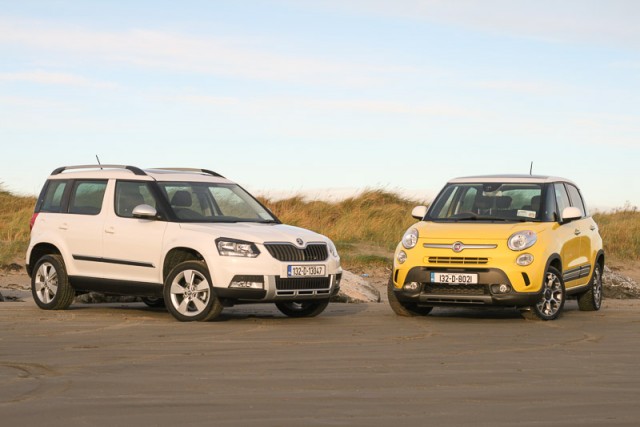 There's no internal debate here; the Skoda Yeti wins the beauty contest without even trying. Even if the 500L was painted a less 'feminine' colour it wouldn't change our minds, as it's just such an unusual looking car. Fiat really tried to force the 500 mould a little too far. In contrast, the Yeti is sharp, contemporary and attractive, but not to the point where it divides opinion. Indeed, in this new facelifted guise it's less divisive than ever, doing without the large round driving lamps of the original. We liked those. As tested the Yeti is in Outdoor guise, which means it gets additional styling cues to make you think it's better off-road. The 500L Trekking gets those too, though the latter actually comes with increased ground clearance, unlike the Skoda. It's worth nothing that both Outdoor and Trekking specification include chunky M+S (Mud and Snow) tyres that are well suited to the rigours of Irish winters and muddy tracks.