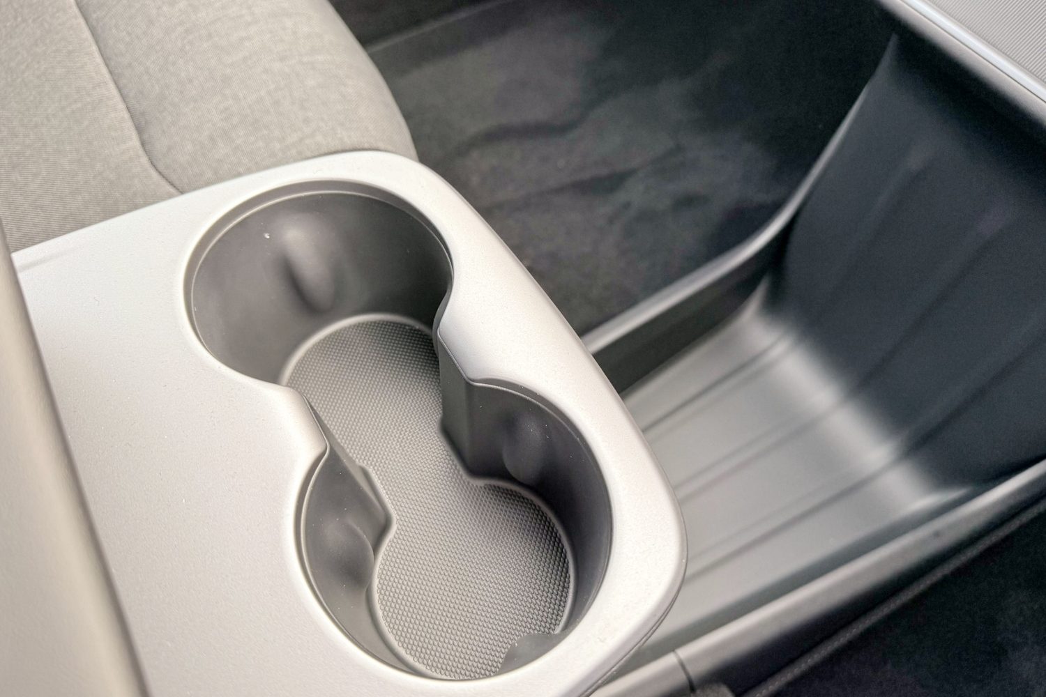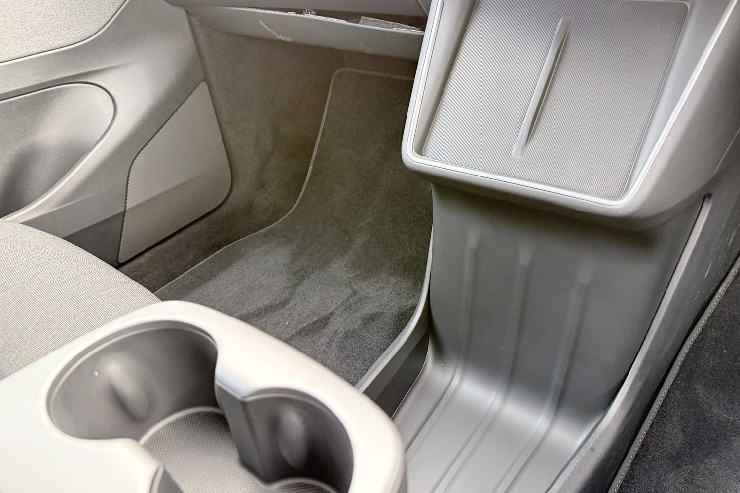 Large door pockets and a big, covered bin under the central armrest up front are found in all versions of the Model Y. There's a sloped section under the dashboard to hold and charge two smartphones wirelessly, though the design of this varies between the Standard car and the others.