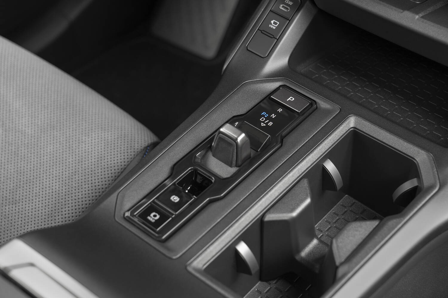 There are two cupholders on the centre console, mounted beside the small, stubby gear selector, and in front of those is a long, but shallow, open storage area beneath the wireless phone charging pads.
