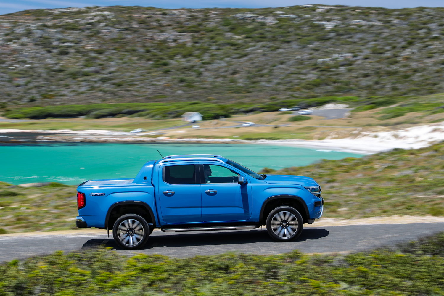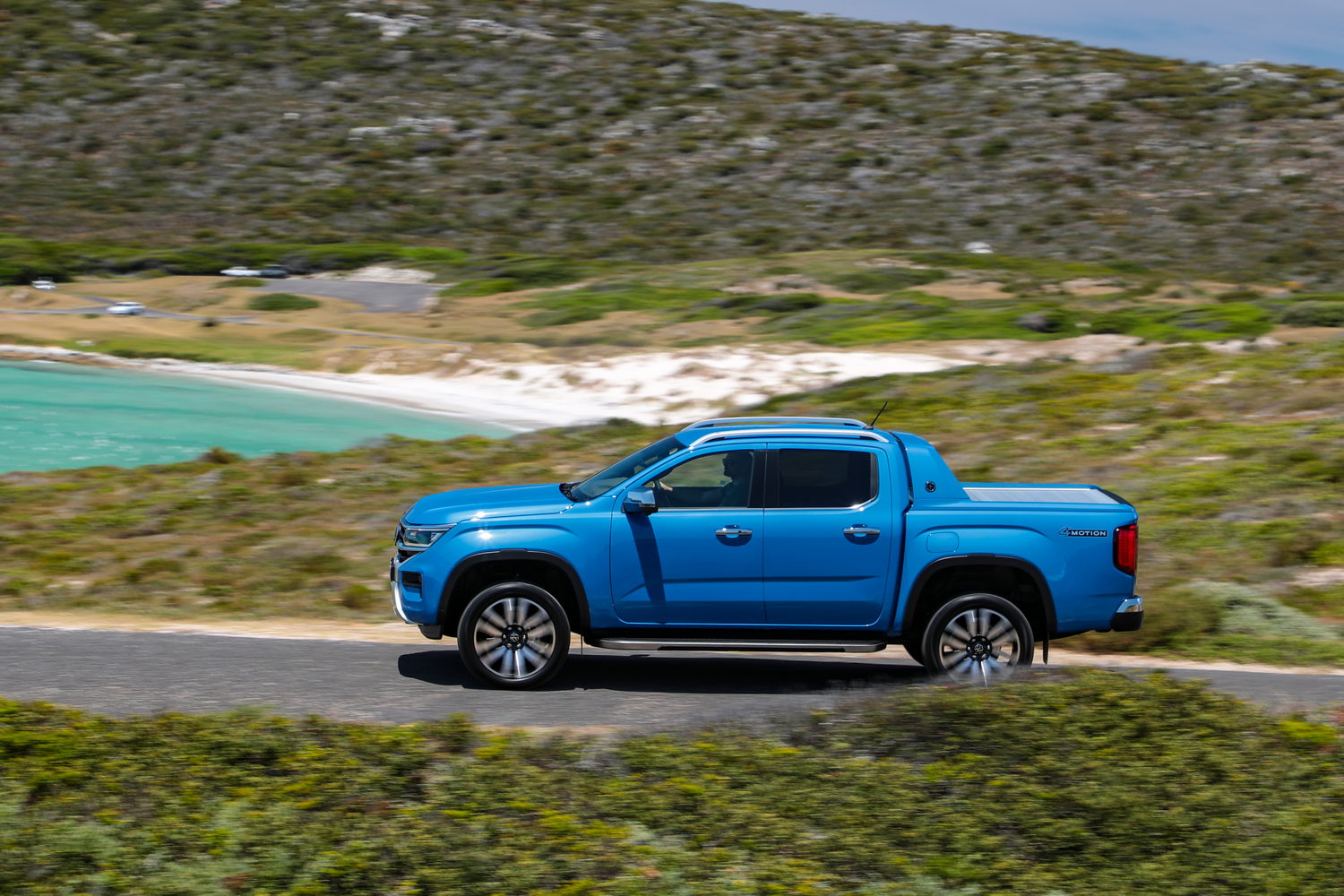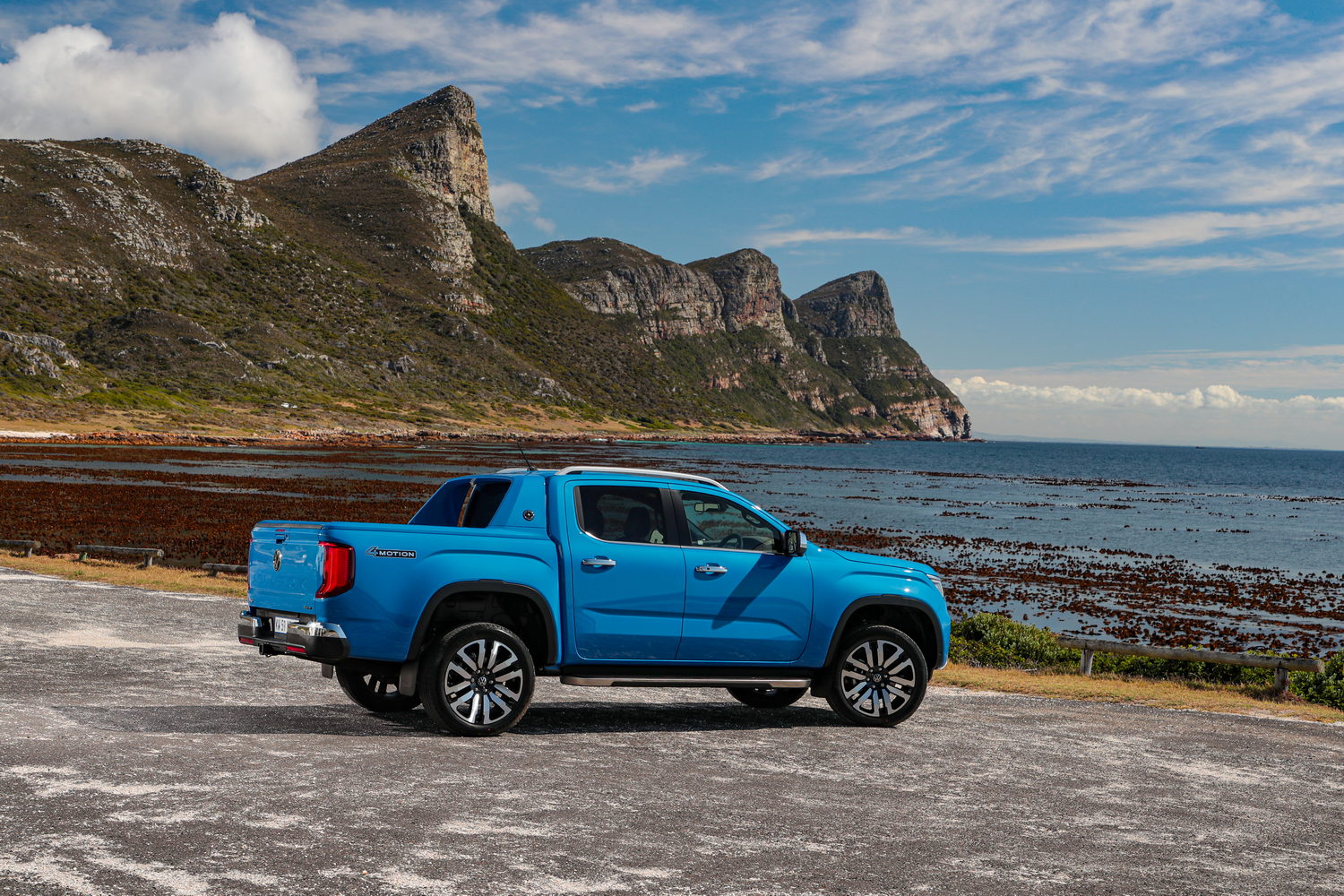 The brightwork continues through to the door handles and mirrors; even the side step has a polished edge along the side, and the roof rails continue the metallic look. They can carry 80kg while moving but up to 350kg when stationary, which is ideal for a roof tent, for example. A unique feature of the Aventura model is the 'Sport Bar' that adds a more dynamic look to the cab's rear and load bed. Affixed to the side of this is a specific Amarok Aventura badge so that everyone can see you have the top-spec model. The Amarok gets more squared-off wheelarches than its first cousin the new Ford Ranger.