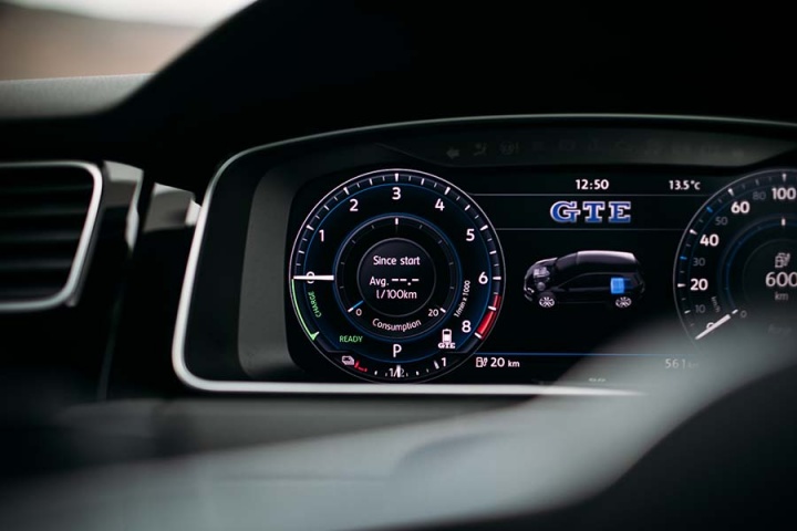 It's a little surprising that engine start-stop isn't keyless in this model as standard, too, as turning a key in the ignition feels old-school given the advanced powertrain. Do that and, most of the time, a little 'bong' is the only sound, as the GTE starts off in purely electric power. In ideal conditions, it can apparently travel for up to 50 kilometres using battery power only and the driver can specify if he wants purely electric propulsion via a mode button to the left of the DSG automatic shifter. The other modes are 'Hybrid' (to allow the system to juggle the engine and electric motor), Battery Charge (forces the engine to run and actively charge up the battery as you drive - not the most efficient thing to do, given you can plug the GTE into an external power source to do this when at a standstill) and 'GTE', where the electric motor and 1.4-litre TSI petrol engine work in conjunction to deliver the fastest responses and highest performance.