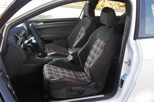Inside, the heavily sculpted leather steering wheel and iconic GTI 'tartan' cloth set this car apart from others as standard, and there are also stainless steel pedals and illuminated door sills. The seats hold their occupants snugly, though comfortably and overall it feels sportier than the regular Golf, without losing that car's sense of incredibly high quality.