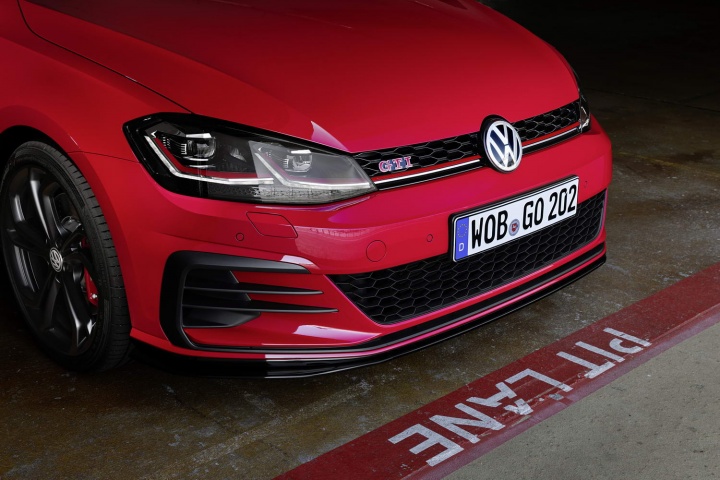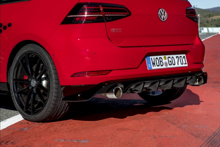 The TCR is available in either three- or five-door configurations, sitting 5mm lower than the regular GTI, and some 20mm lower than the common-or-garden Golf. Behind the standard 18-inch alloy wheels lurk the same disc brake and pad setup from the Clubsport S, while larger 19-inch wheels are optionally available as part of an upgrade package that includes the upping of the top speed to 260km/h. Other visual elements on the GTI TCR include a bespoke front splitter and two additional water radiators like in the Golf R, to help cooling. Further back, there are sill extensions in a contrasting colour and a small TCR logo sits ahead of the rear wheel arch, while the rear spoiler gains a small lip on the end and a more purposeful rear diffuser rounds off the look.