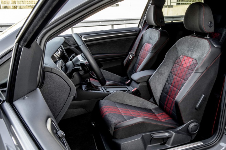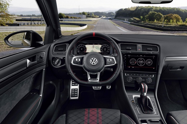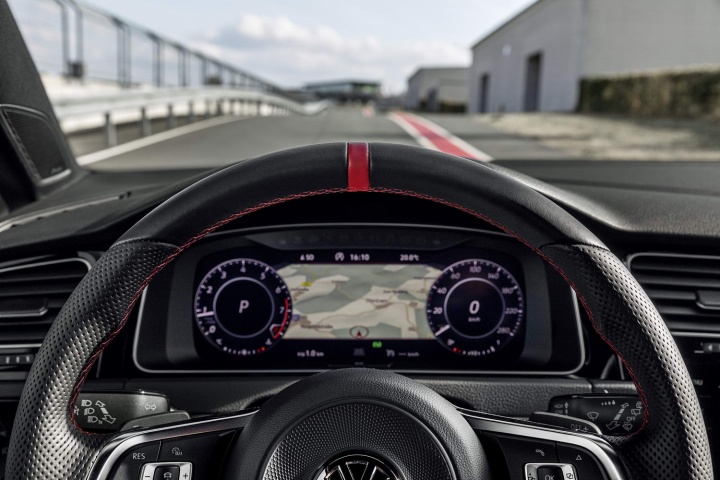 The traditional GTI tartan seat inserts make way for a bespoke TCR design and the sports seats hold their occupants in place. Volkswagen continues its motorsport theme with a leather steering wheel that has perforated leather on the sides and a red twelve o'clock marker at the top. Ahead of the driver is the digital Active Info Display that offers plenty of different views and data readouts, including a lap timing function.