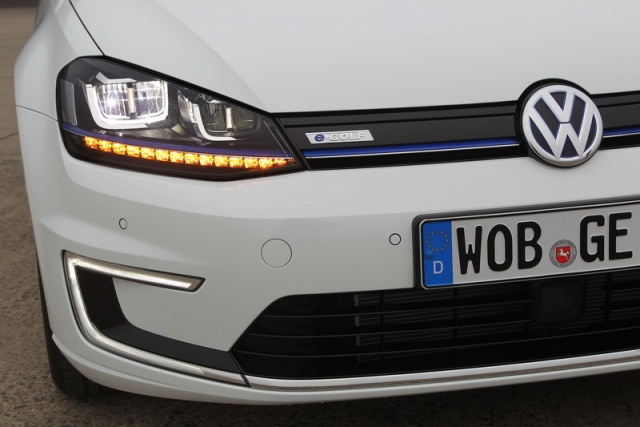 Approach the e-Golf for the first time and you would be forgiven for mistaking it for a 2.0-litre TDI Highline model; there is little to mark this out as an electric car and you are unlikely to pick one out as it drives past you in traffic. Look a bit closer though and the tell-tale signs begin to appear. There is a closed off front grille like that fitted to the BlueMotion Golf, only this time with a unique chrome strip off set by a blue stripe, mimicking the red stripe of the GTI. Blue also highlights the VW logo on the grille and a badge on the wing. LED lights all around are standard fit, though a regular Golf can be ordered with them. It cannot be ordered with the unique C-shaped Daytime Running Lights in the front bumper, however.