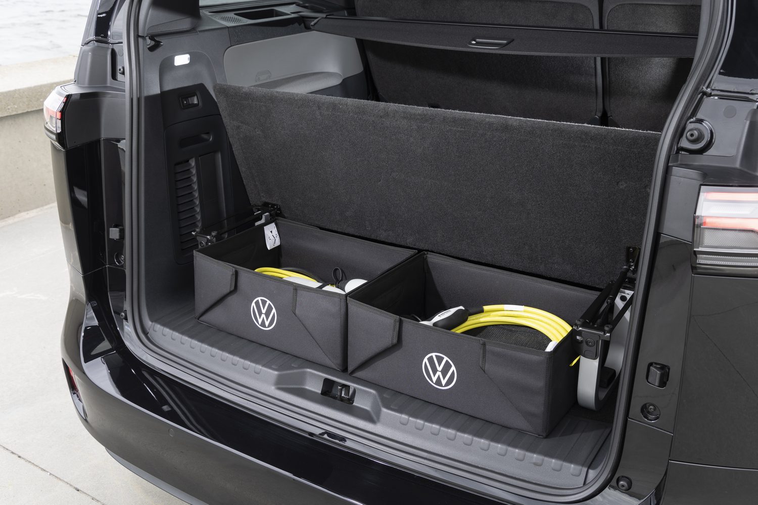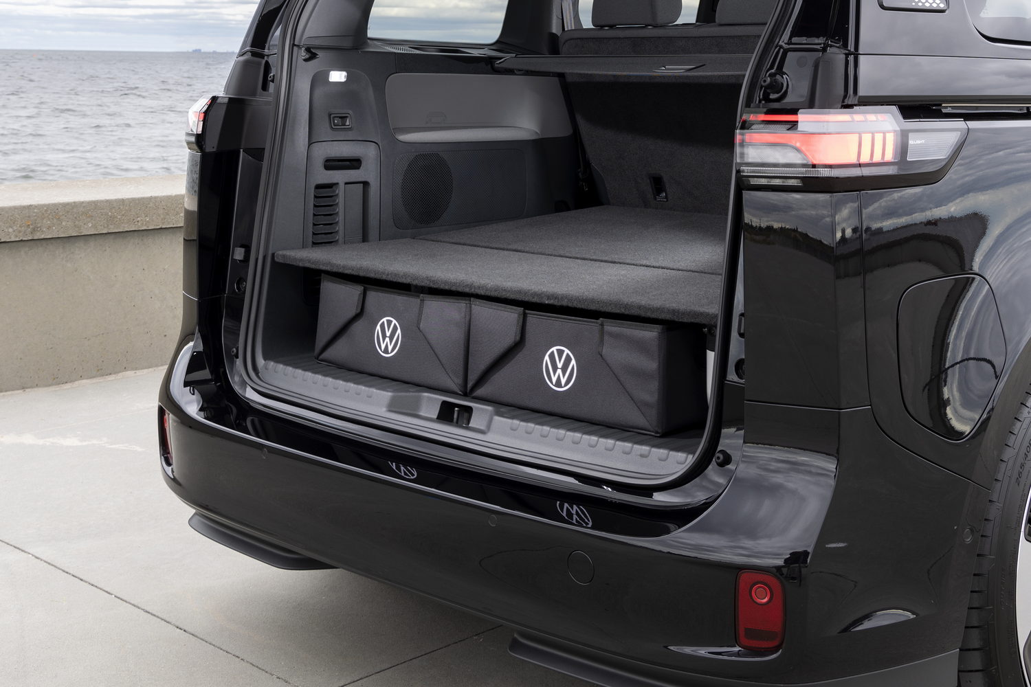 The ID. Buzz's large tailgate might not always be the most practical, but the low load height has its merits. A boot volume of 1,121 litres is generous and Volkswagen includes a removable floor that can hide storage underneath for items such as charging cables while also providing a fully flat floor when the rear seats are folded down.