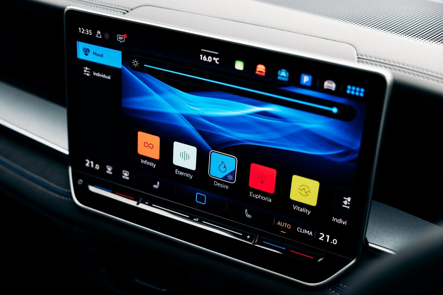 Up front, the dash is the same as that of the Tiguan's, which means you get the generally impressive new 12.9-inch touchscreen, clear and simple digital instruments and a single physical rotary controller which looks after stereo volume and driving modes (as well as VW's slightly twee 'Atmospheres', which change the colour and tone of the ambient lighting).