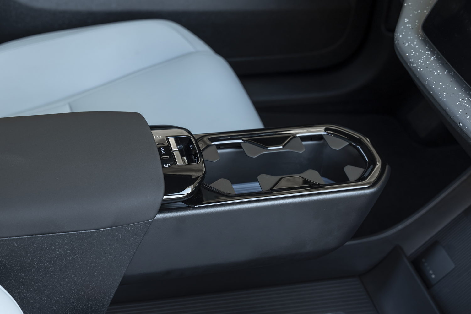 The front of the cabin is very practical, with good-sized door bins (lined with soft material so stuff doesn't rattle about) and a large open storage area between the seats. That area has its own shallow lidded section with two USB-C sockets, and there are two slide-out cupholders in the big centre armrest. There's also a wireless phone charging pad at the base of the dashboard.