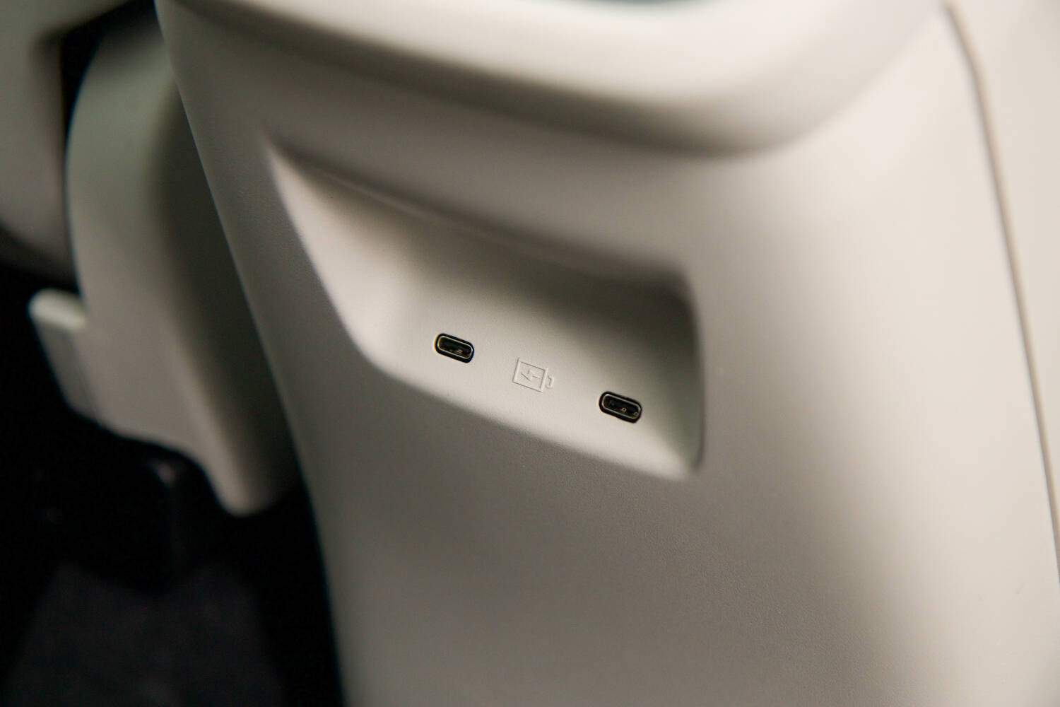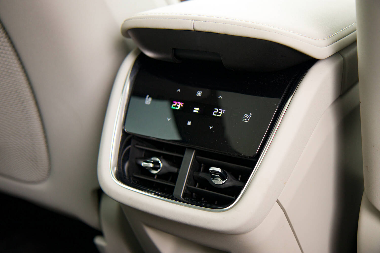 If you've only two in the back, there's a helpful armrest in that centre rear seat, with covered cupholders so you won't be dropping your elbow into the void every time. There are also handy seatback nets, as well as rear seat temperature and heated seat controls and USB-C sockets. The front headrests are also quite slim, so you get a decent view out.