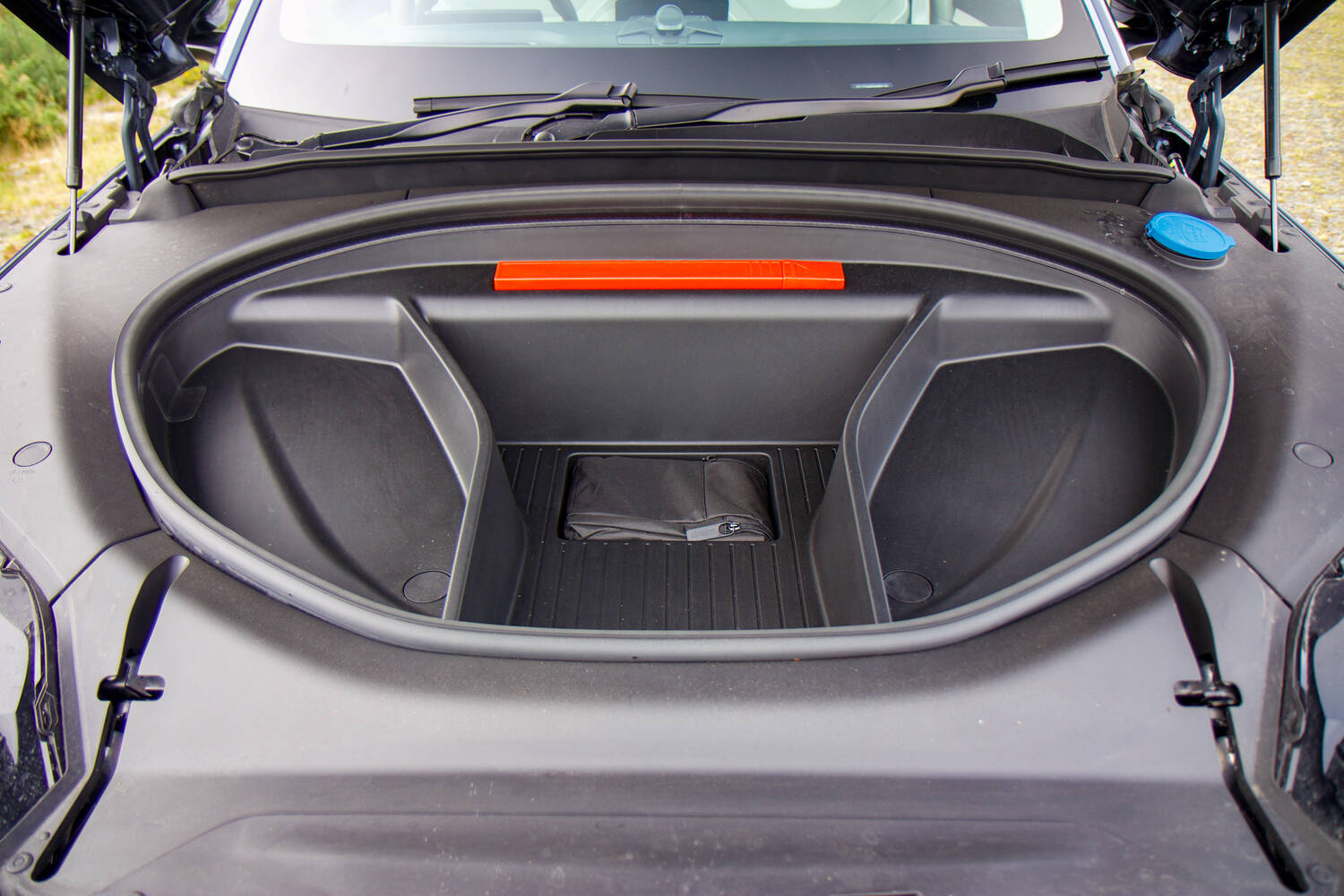 There is a useful 'frunk' in the nose though, which is large enough for you to stash charging cables, and the main boot has some useful additions such as neat foldaway luggage hooks.