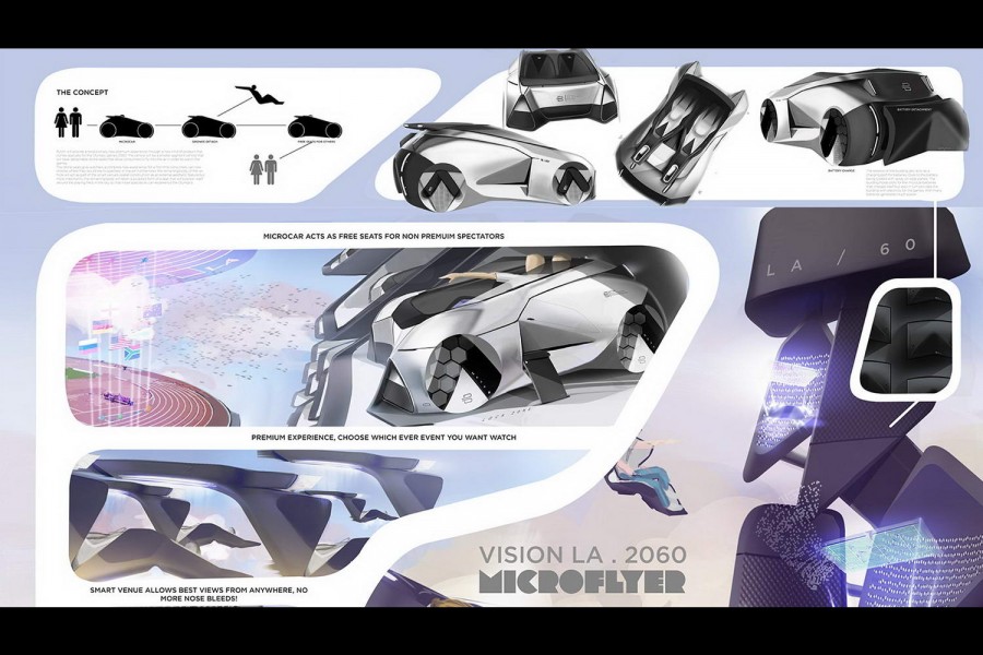 Byton Design, dreams up a compact car that features flying drone seats for airborne sports viewing...