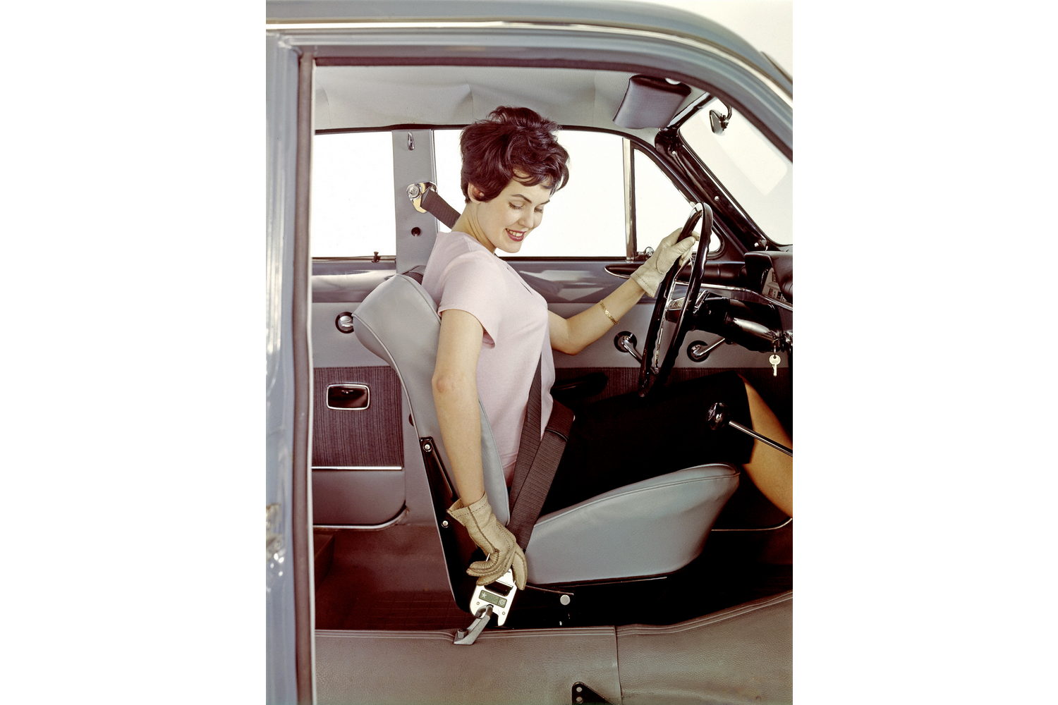Fine, but a six-point harness is useless in a road car, as it doesn't allow you to stretch and move around to reach switches and so on. Lap belts, however, had started to trickle into cars in the 1950s. Nash was one of the first car makers to offer seatbelts, starting in 1949, while Ford began to offer them as an option (which only two per cent of buyers took up) from 1955. In Europe, Saab was the first car maker to fit standard seatbelts, starting from 1958.