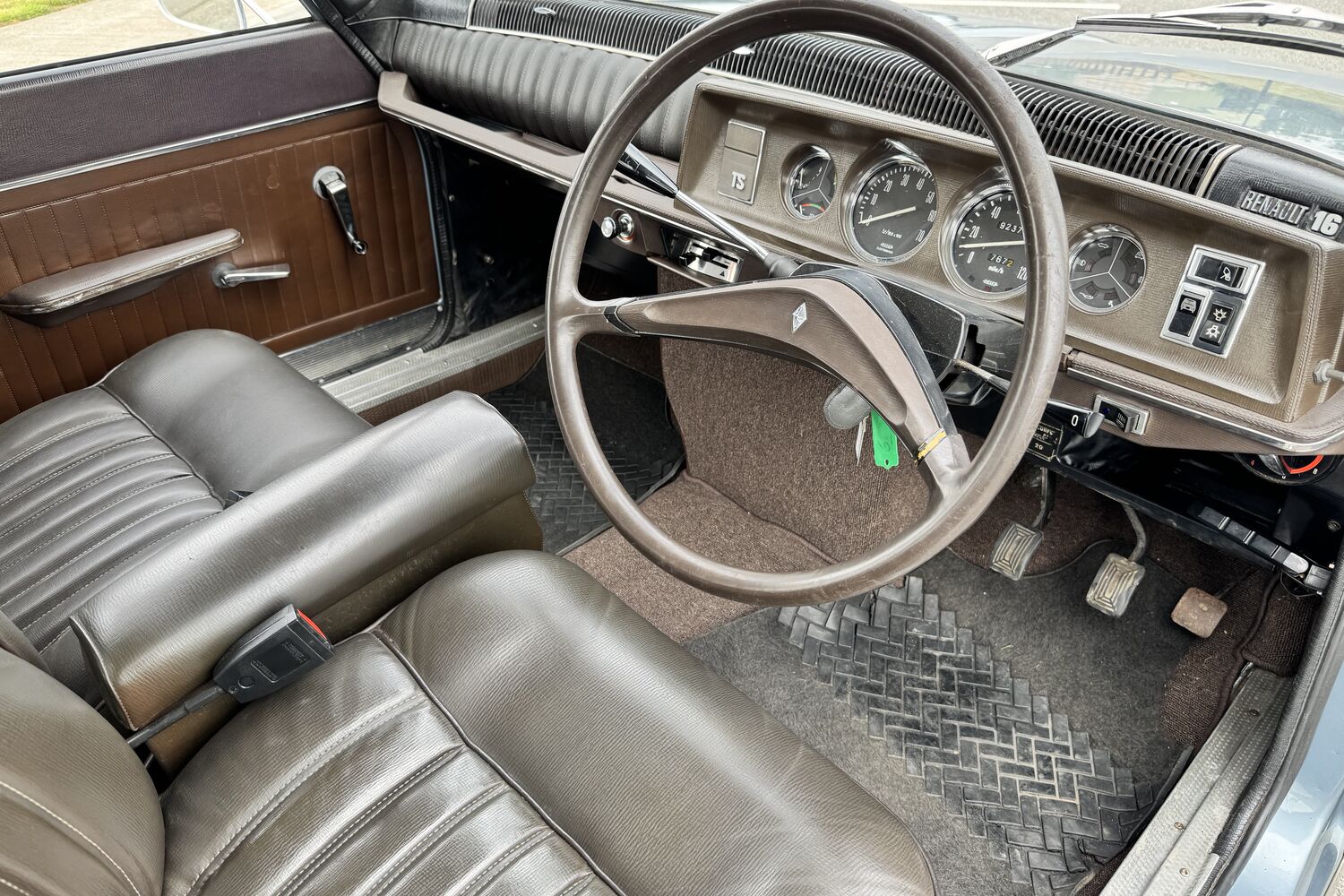 The 16's dash is pretty simple - there are four round clocks set into a brown plastic dash (a combined fuel, temp and oil gauge, a rev counter, a speedometer and a warning light cluster) and you front up to an incredibly spindly two-spoke steering wheel, which again has a dinky little Renault diamond at its centre.