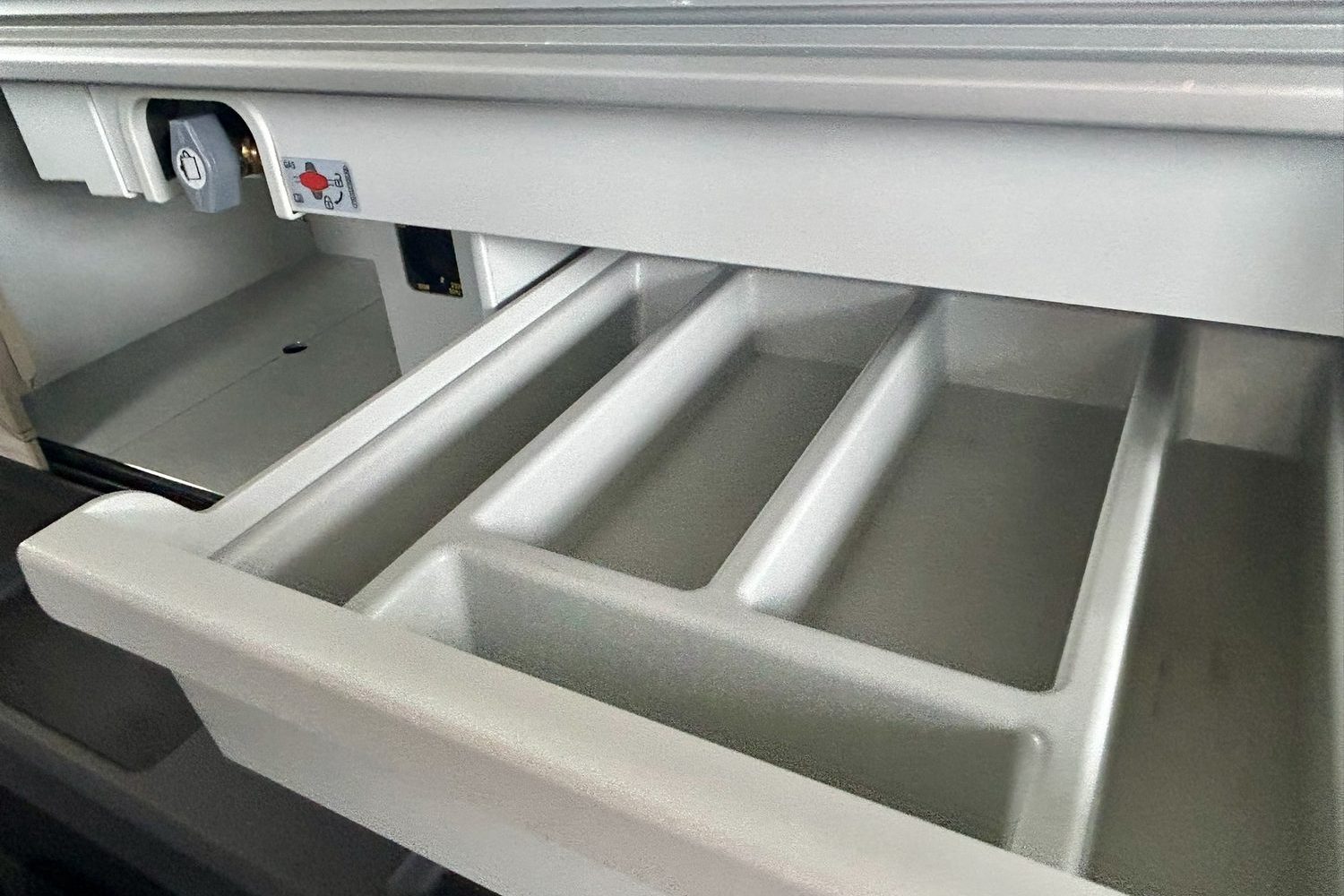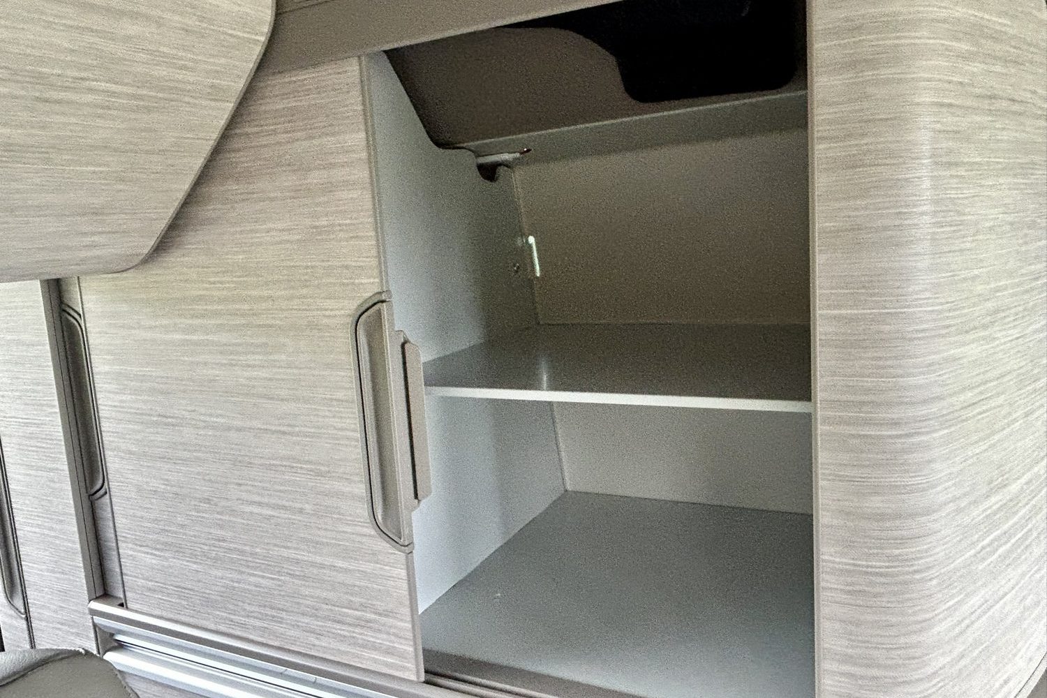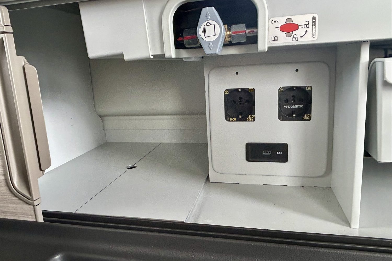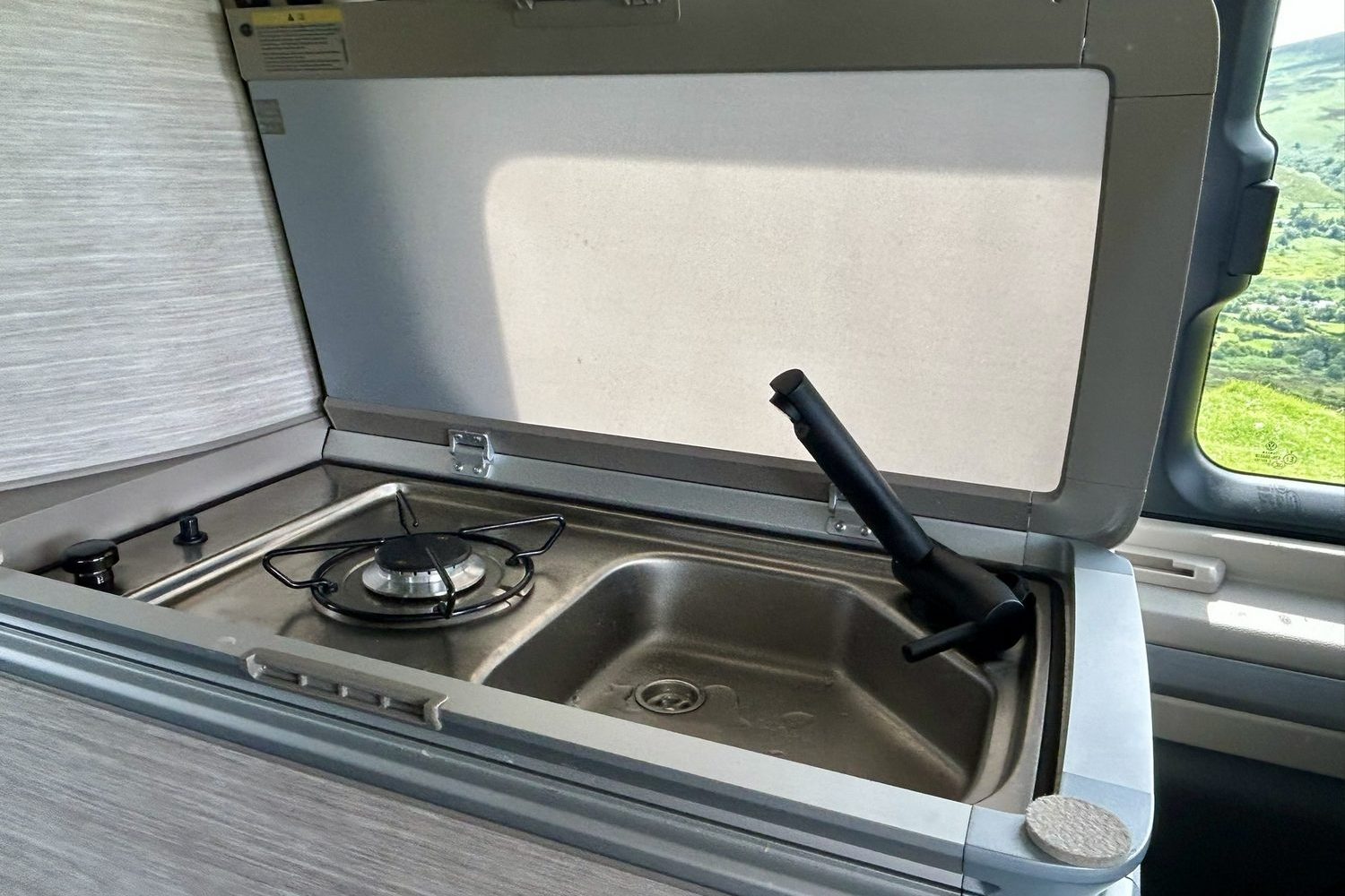 The touchscreen system also manages the slide-out fridge that lives under the small sink and single-burner gas cooker and, as I mentioned, the heating. Turn that on and the California's living quarters turn toasty-warm in an instant, but you will run down the leisure battery fast if you do that, and with no external electric power at this campsite, that's not a great plan.