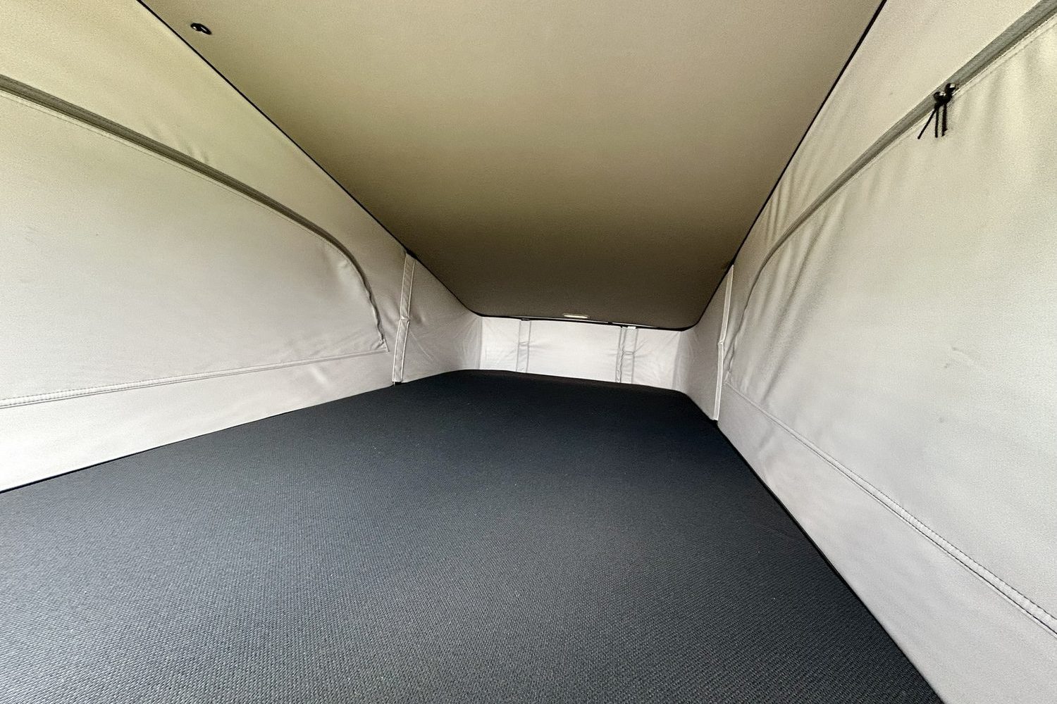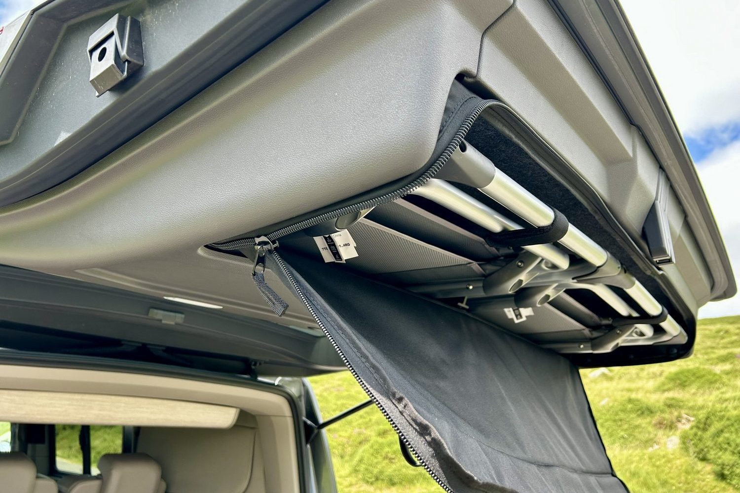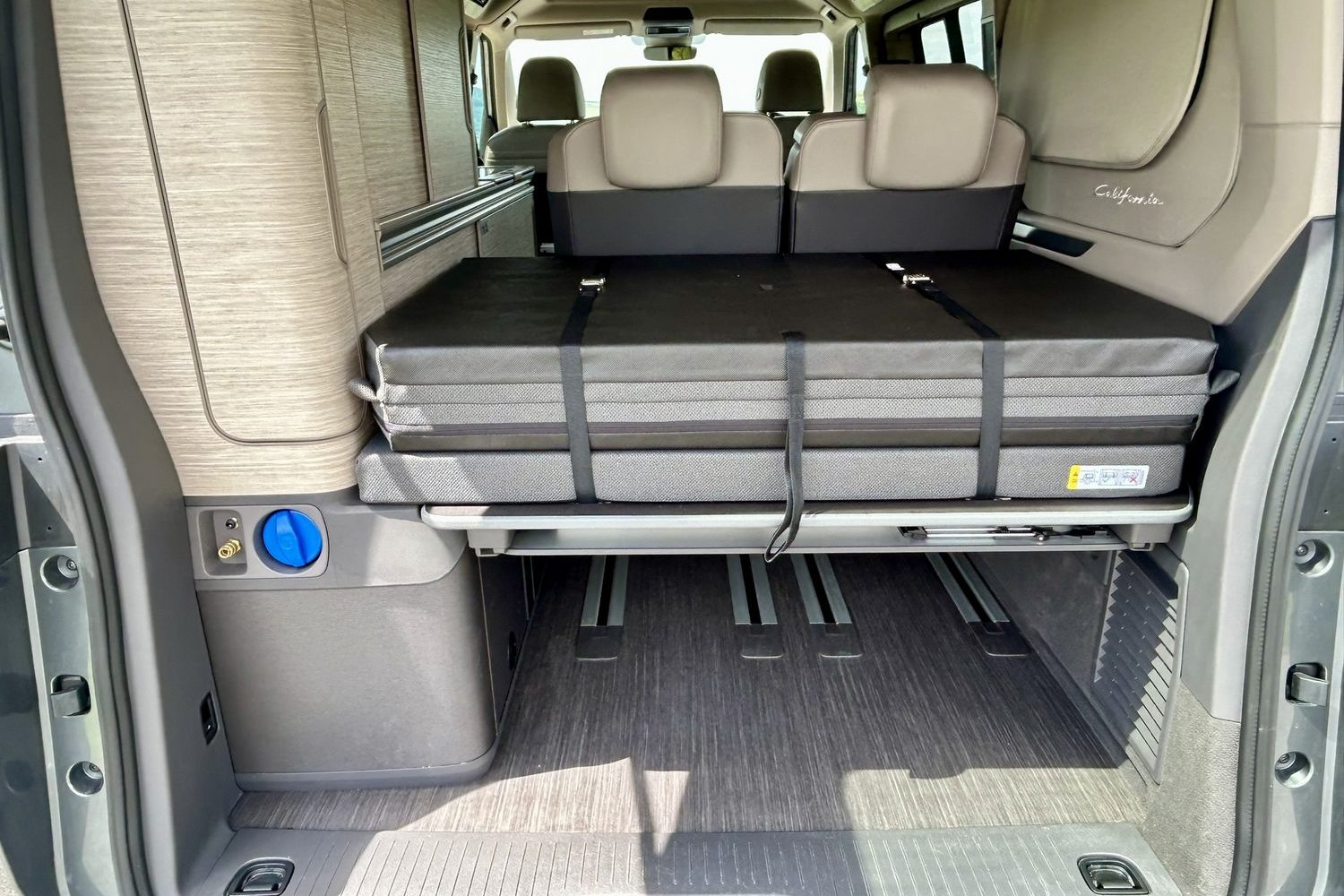 When you're not worrying about a spilling-over bladder, the sleeping bit of the California is actually a rather wonderful place to be. It feels snug and enveloping, secure and comforting even when outside the wind is whipping up and the rain is lashing down. There are neat blinds built into the side windows and the rear screen, and handy magnetic clip-on curtains for the windscreen and front windows. Once these are all in place, you feel utterly at home in your small, but useful space.