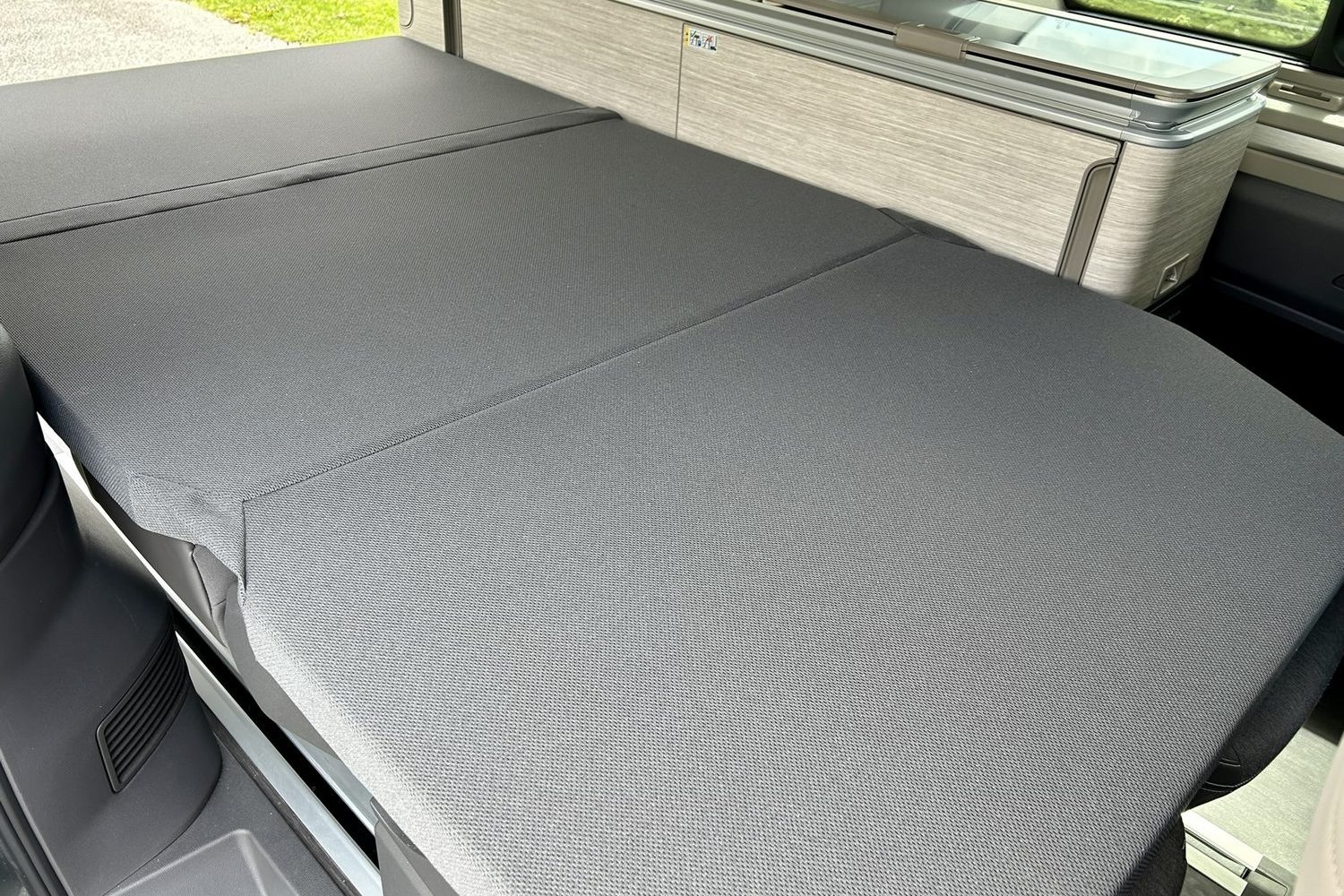 Central heating, on a camping trip? Well, that's one of the joys of the Volkswagen California. On a small digital touchscreen just by the edge of the folded-out 'downstairs' bed (a slim futon-style mattress that rolls out over the top of the flattened back seats, which is way comfier than it sounds) there's a series of controllers for adjusting the pop-up roof that allows either standing-up space in the living area, or the inner-part of which flips downward to form an even comfier double bed.