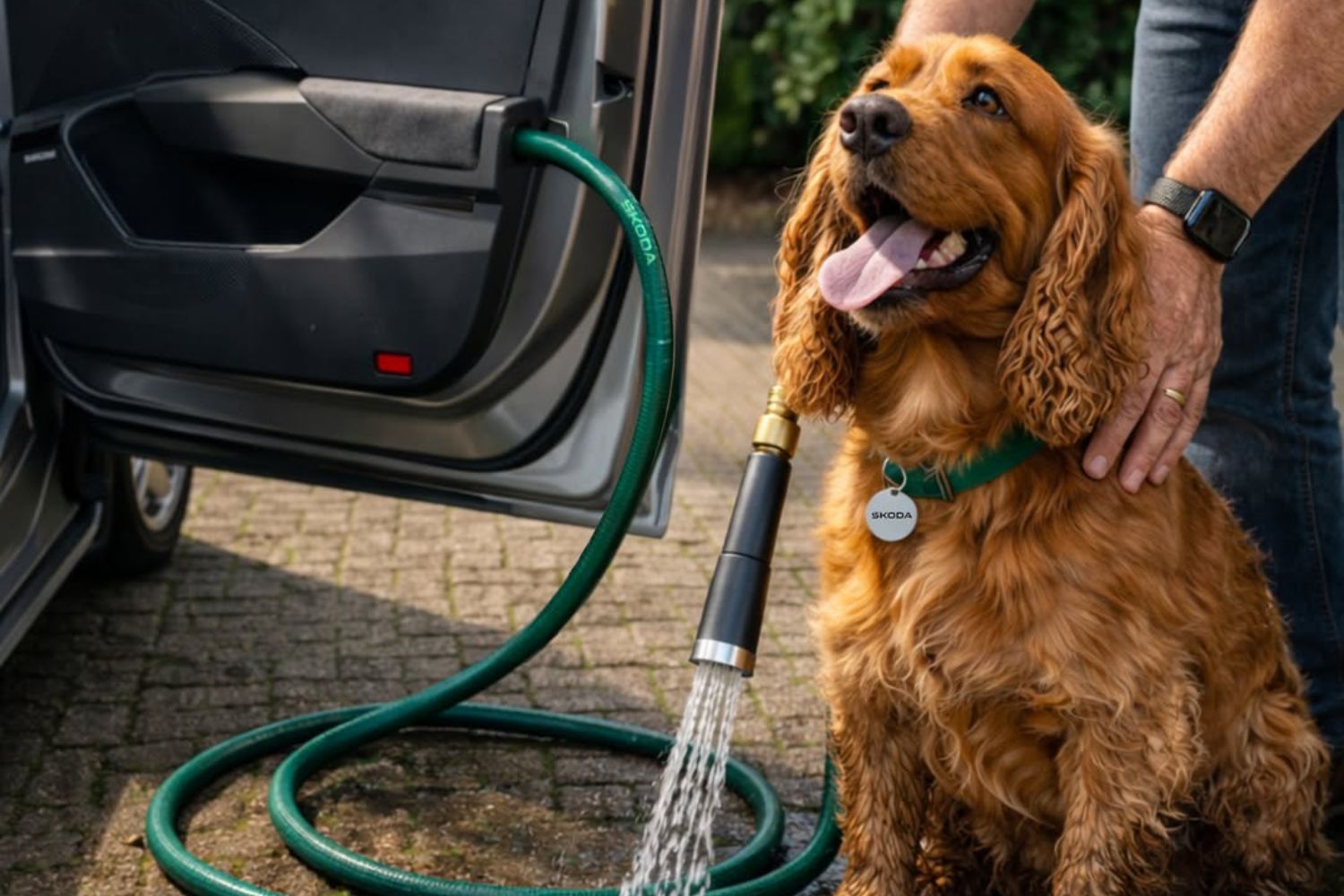 Apparently, the hose has three settings (no, it doesn't…). Those are: Skoda Spritz - for a quick-wash function for lightly muddy escapades; Matted in mud - a mid setting for dogs that made the most of every puddle on the walk; and I love you, but you're not getting in my brand-new Skoda when you are this muddy - the strongest setting to get the dirtiest of dogs perfectly pampered.