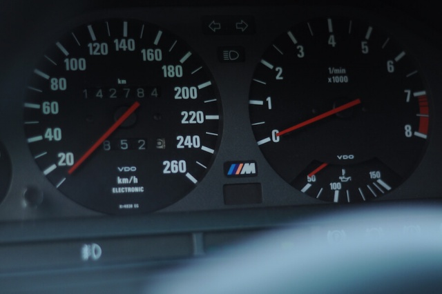 In your hands sits the most beautiful steering wheel ever found in a production car, trimmed in Alcantara, along with the gear knob and handbrake lever. The wheel itself seems to sit at a slightly strange angle like all other E30s, and the driving position given by the snug Recaro bucket is upright and business-like. In to first (left and back thanks to the dogleg pattern of course) and off you go, with just a tickle of revs enough to get you moving. After about 50 metres you know exactly what the M3 is going to handle like. The communication through the wheel and seat base is on another level to anything I've ever driven, and is a perfect demonstration of the benefits of properly sorted damping supporting a stiff chassis. It's a fantastic experience, feeling every single millimetre of tarmac under the tyres fizz into the palm of your hand and the seat of your pants, and it's this sort of feedback that inspires confidence and gives you the courage to push the M3 hard almost straight away. The shift on the Getrag gearbox is supremely positive, and the engine pulls nicely from low down without really blowing your socks off, saving its party piece for later in the rev range as the needle chases the redline like a maniac and the induction noise fills the cabin with a demonic wail.